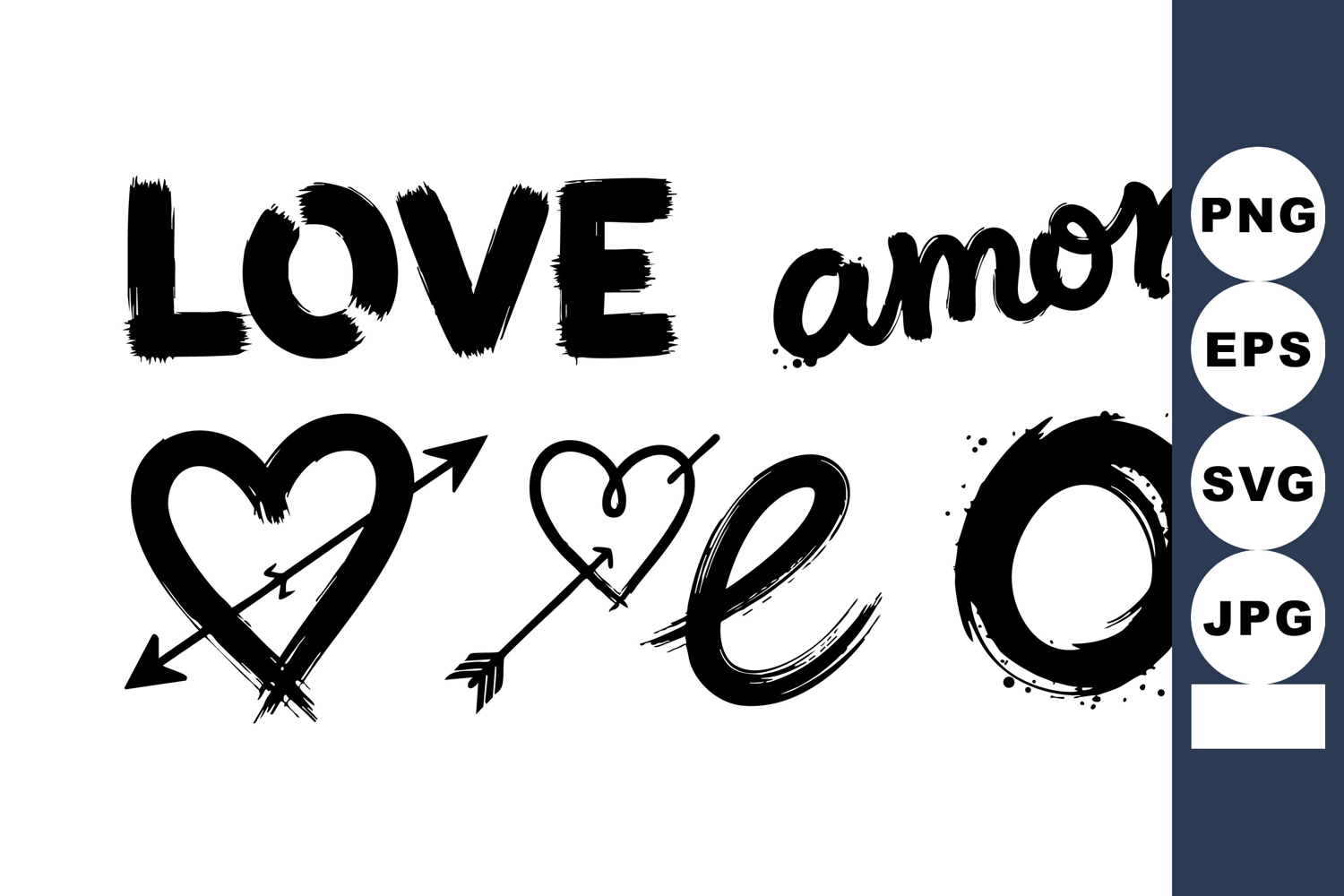This vector image shows love themed hand drawn hearts with arrows and lettering in black brush style including amor and circle elements creating romantic mood
