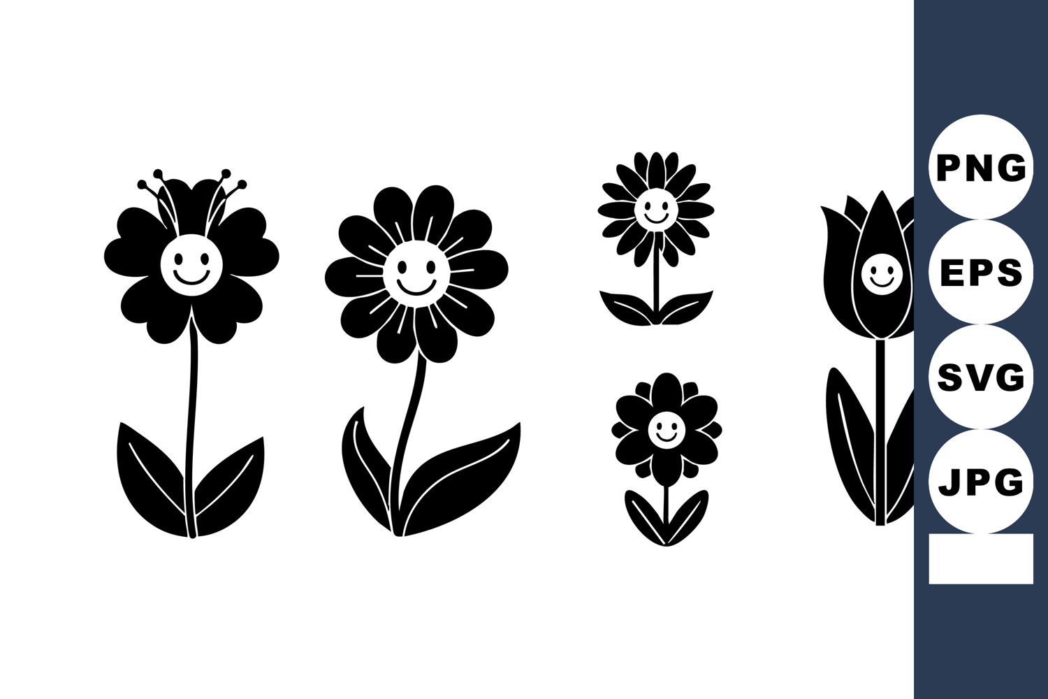 Flowers With Leaves Flowers With Stems Spring Summer Flowers Garden Floral Illustration Cheerful Flower Design Black Silhouette Flowers Happy Flower Faces Smiling Cartoon Flowers Simple Playful Flowers Cute Flower Icons