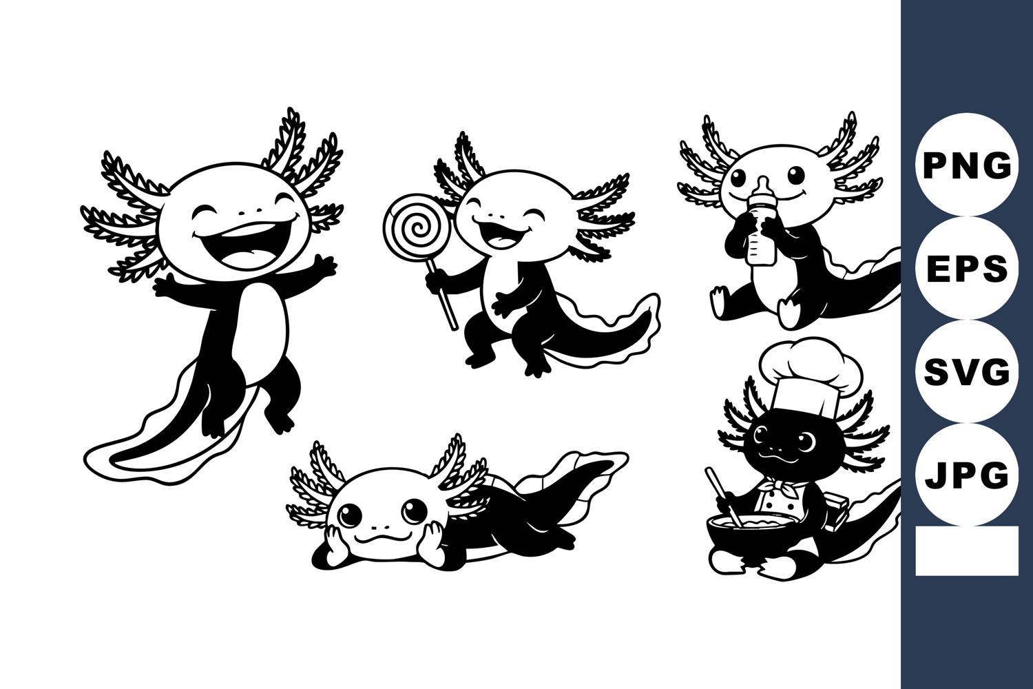 This black and white vector shows five joyful axolotl cartoon characters in different playful poses including cooking and eating with a cheerful mood.