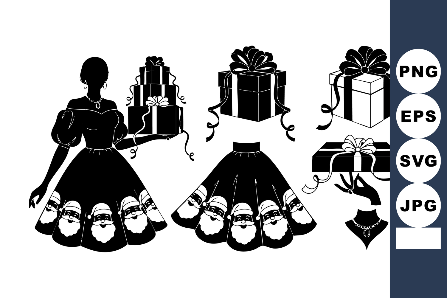 Pattern Black White Black White Vector Retro Woman Holding Woman Holding Gift Holding Gift Boxes Gift Boxes Santa Boxes Santa Claus Santa Claus Skirt Claus Skirt Pattern Skirt Pattern Black
