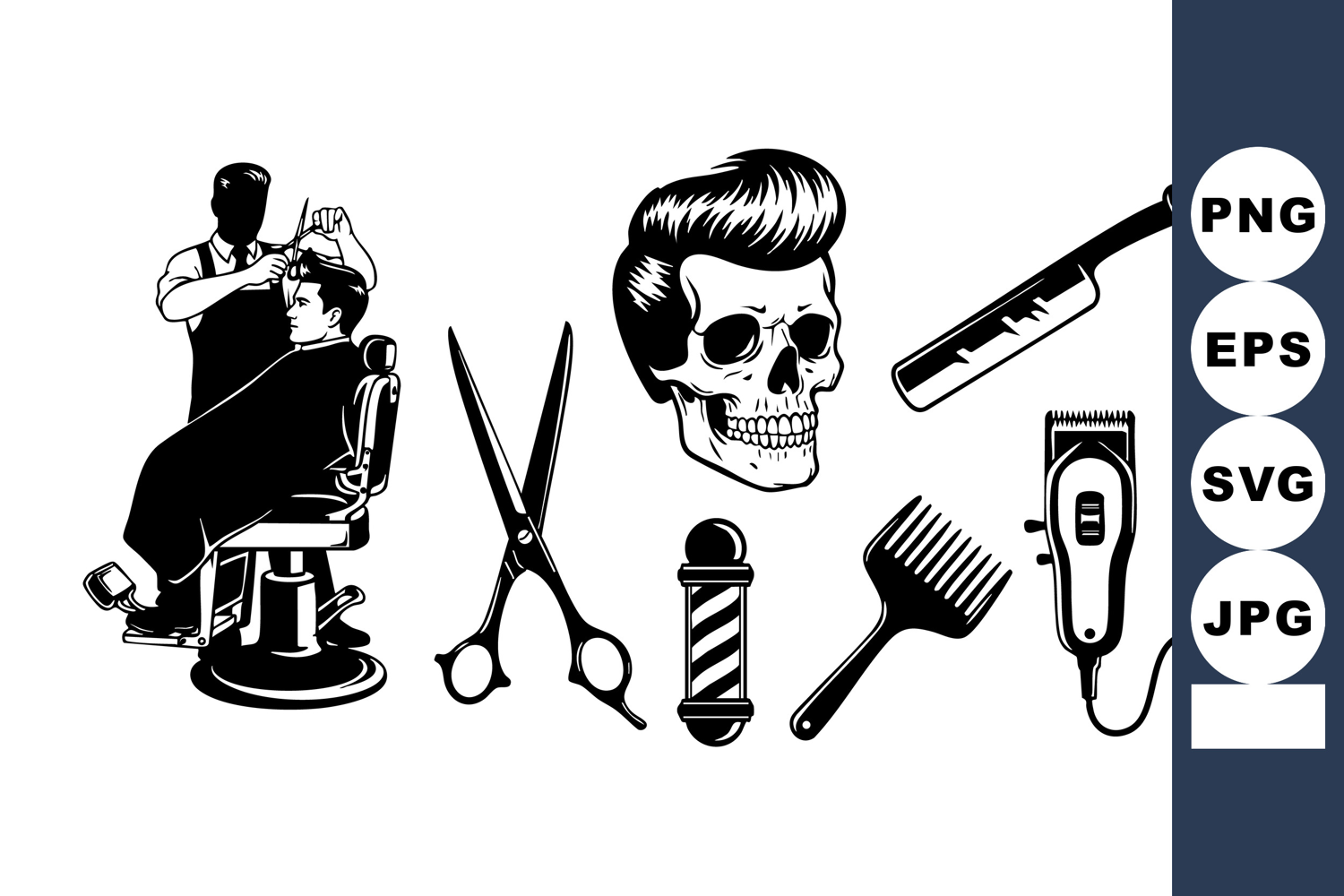 Black And White Barber Shop Tools Haircut Scissors Razor Classic Grooming Elements Vintage Barber Design Professional Vintage Mood Hair Clipper Skull Styled Haircut Skull Barber Chair Style Haircutting Tools Set
