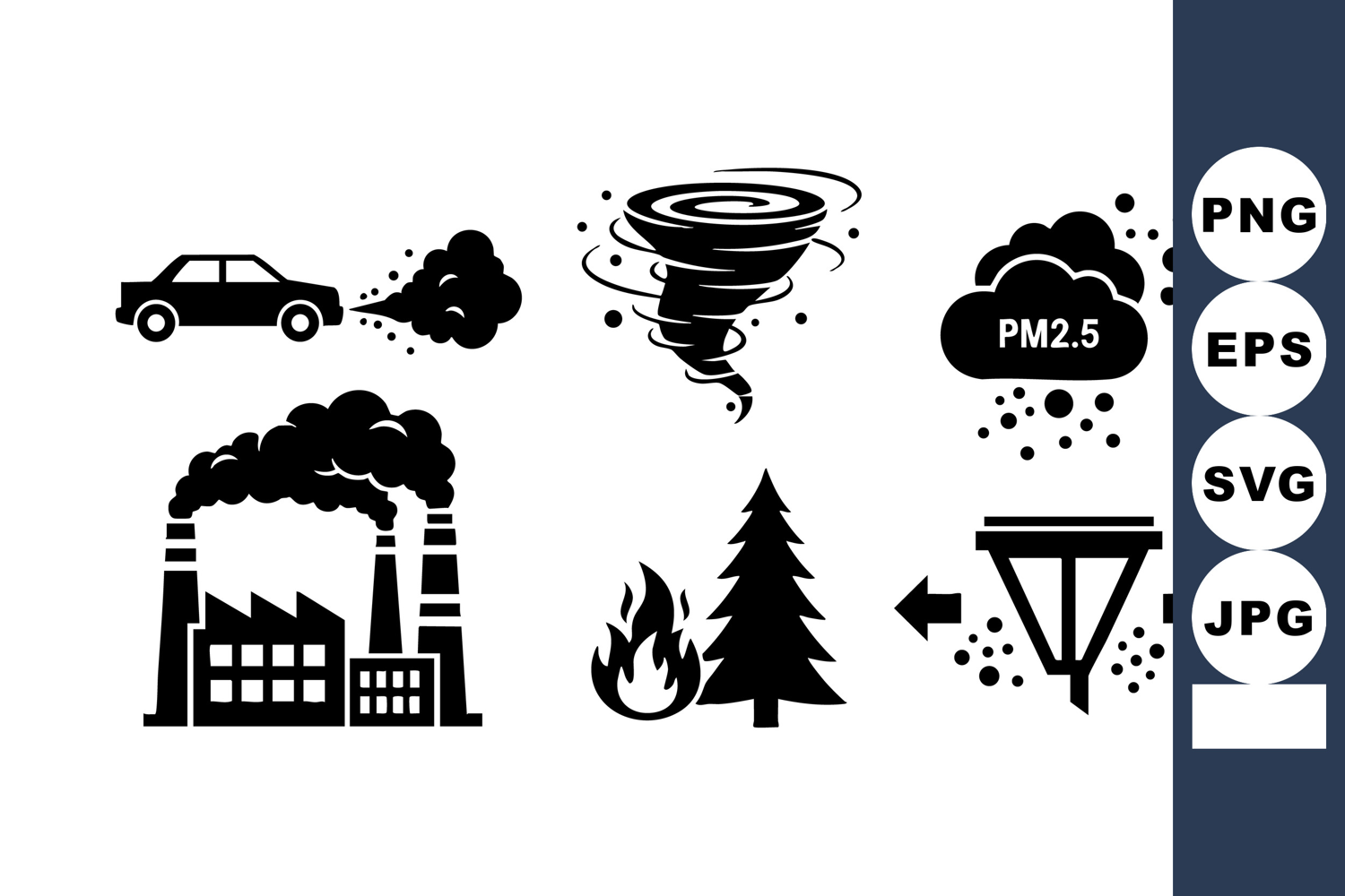 Black Silhouette Icons Environmental Hazard Vector Pollution Icons Set Factory Smoke Icon Car Exhaust Silhouette Wildfire Tree Vector Tornado Pollution Hazard Air Filter Illustration Pollution Control Vector Smoke Emission Icon