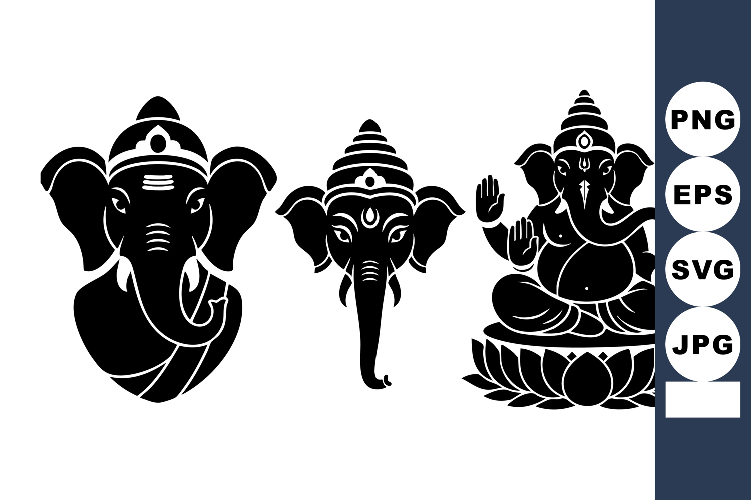 Bold black silhouettes depict the Hindu god Ganesha with detailed head designs and symbolic lotus and blessing hand gestures in a spiritual and traditional style vector illustration peaceful