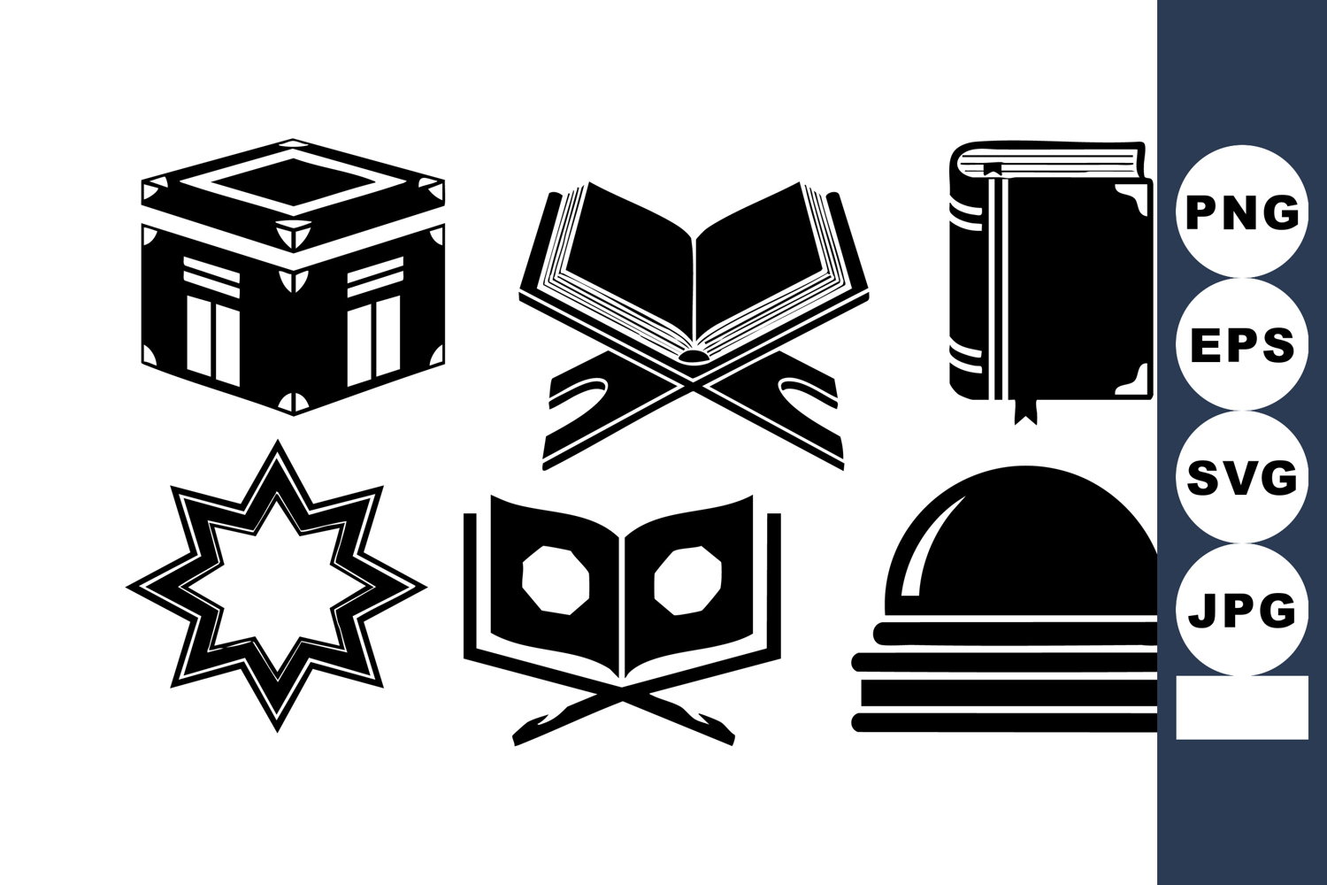 A bold vector set displays various Islamic religious symbols including the Kaaba, Quran, star pattern, and dome shapes in black silhouette style for cultural design projects peaceful