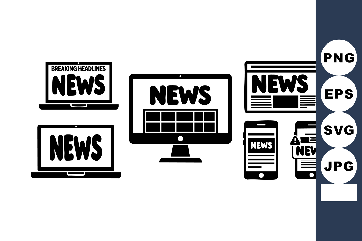 Bold black and white vector design shows news headlines displayed on laptop computer desktop monitor smartphone and tablet screens conveying information and communication in modern digital style vibrant