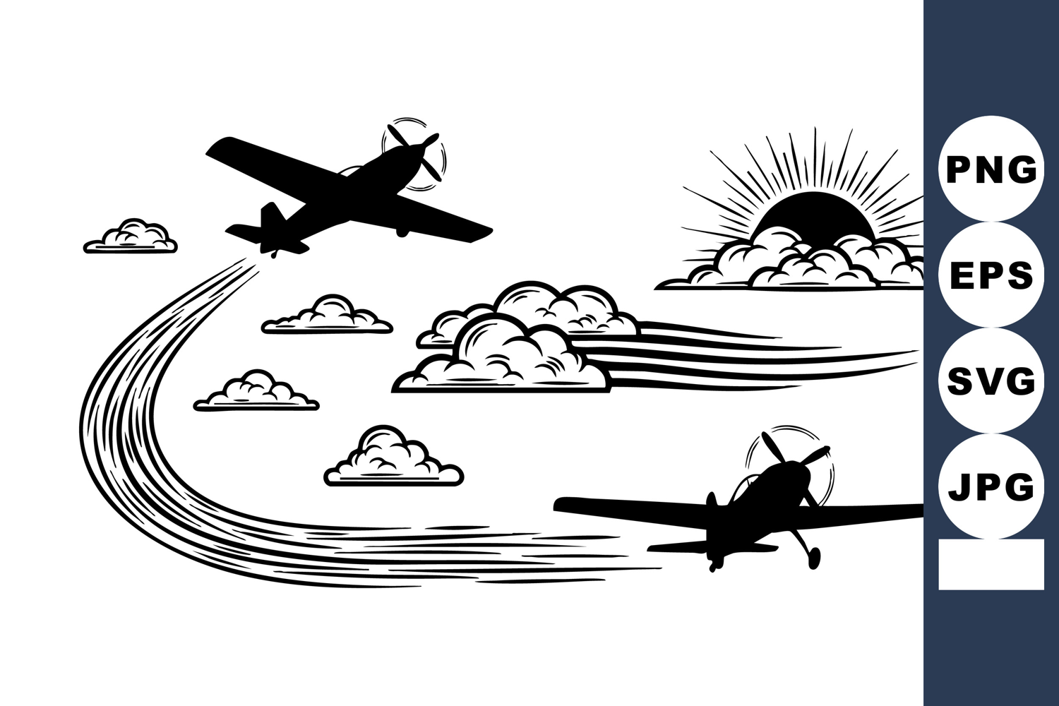 Retro style airplanes fly through the sky leaving swirling trails among fluffy clouds with a radiant sunrise in the background creating a nostalgic and dynamic mood