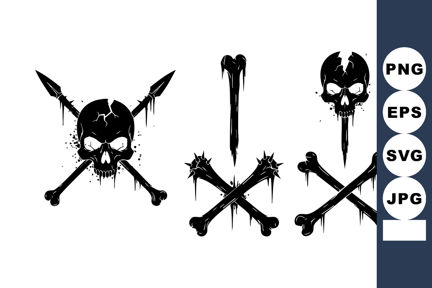 A dark gothic vector set displays cracked skulls combined with crossed bones and spears in a bold style perfect for tattoo art or edgy designs. Intense and powerful mood.