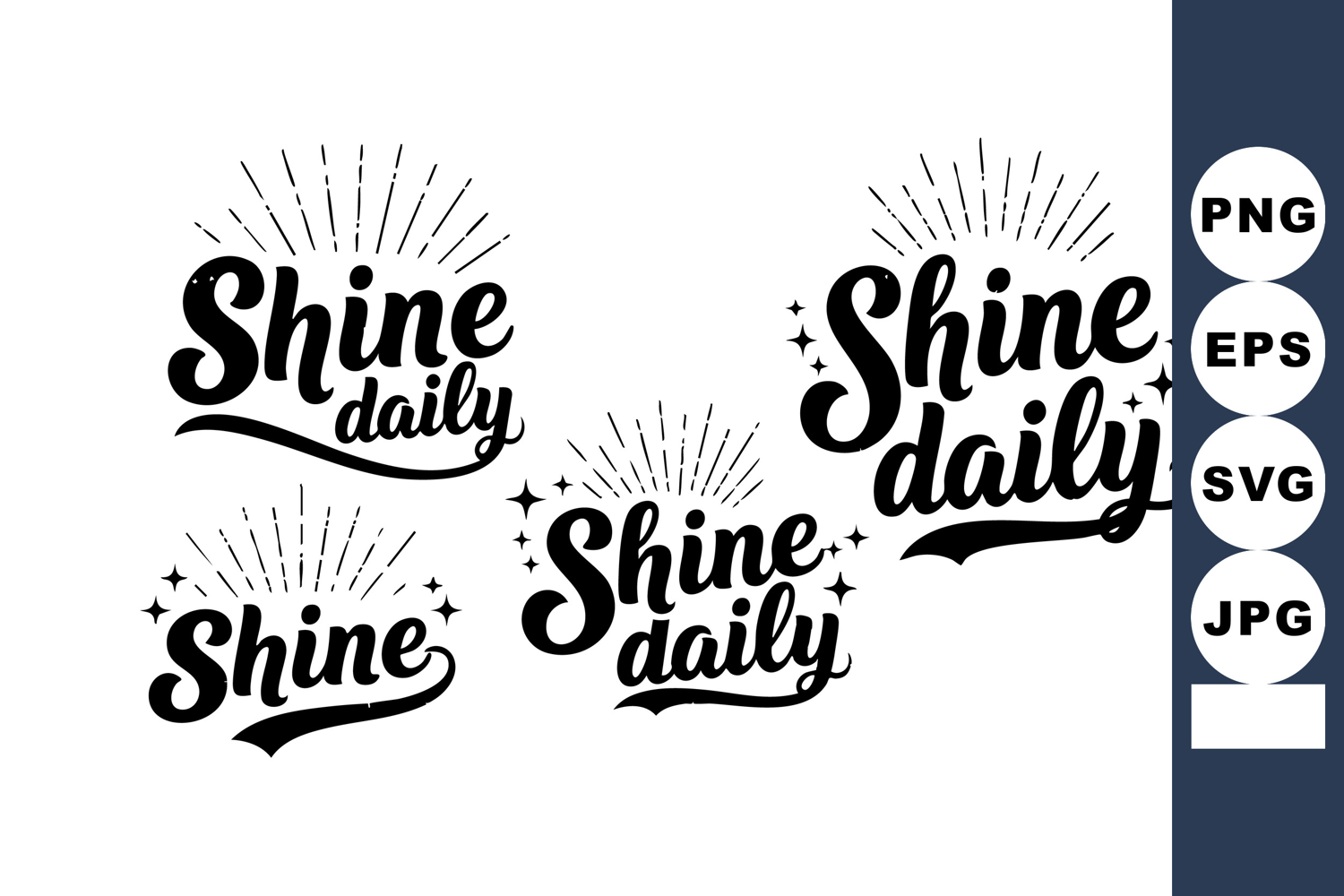 A bold typography design set featuring the phrase shine daily with radiant starburst and sparkle elements conveying motivation and positivity in a clean black style.