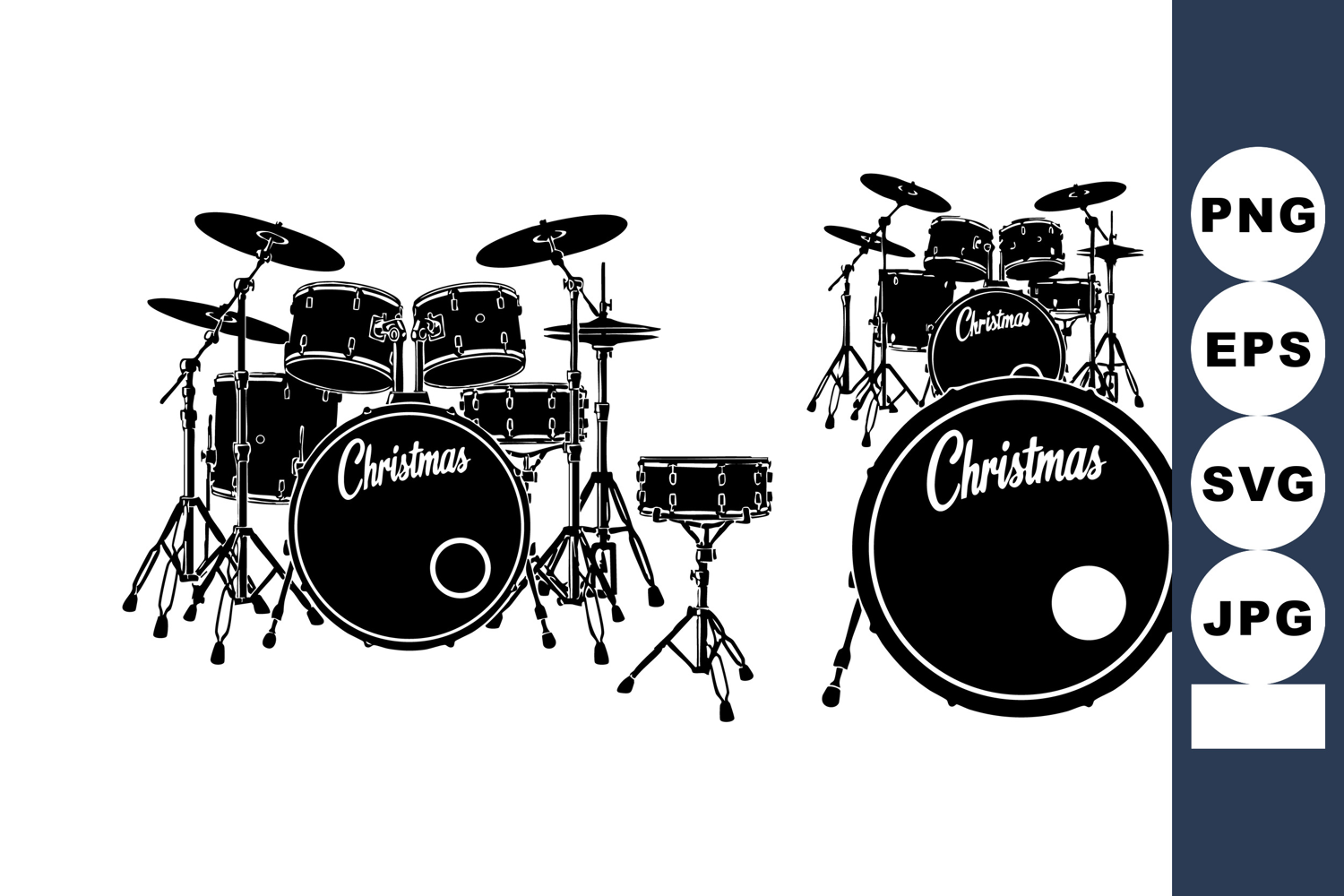 A black and white vector illustration shows a detailed drum set featuring Christmas text on the bass drum, ideal for holiday music themes and festive designs, vibrant and bold.