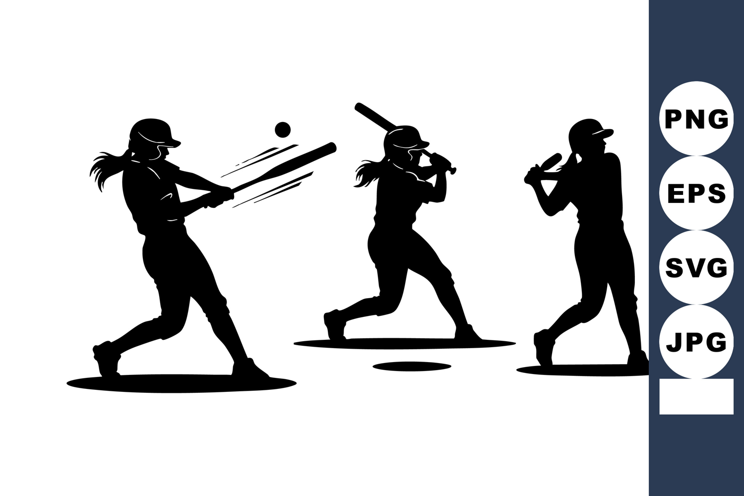 Dynamic silhouettes showcase female softball players in various batting stances with a bat and ball. The bold black shapes emphasize movement and energy in a sporty design. Edgy mood.