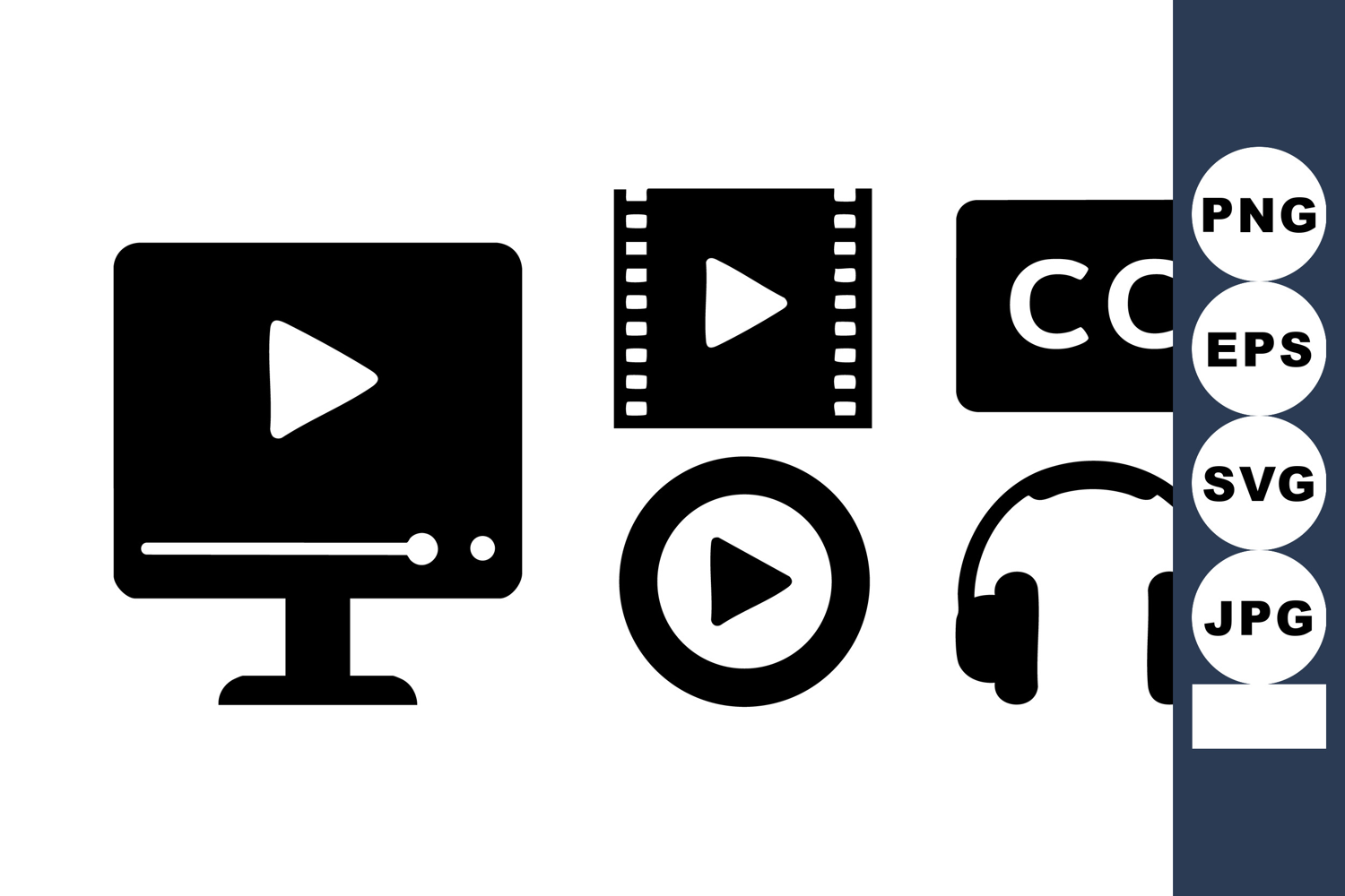Video Player Icon Play Button Control Media Screen Design Filmstrip Movie Clip Stream Multimedia Audio Headphones Sound Caption Closed Subtitle Text Digital Technology Display Monitor Symbol Graphic Black Silhouette Flat