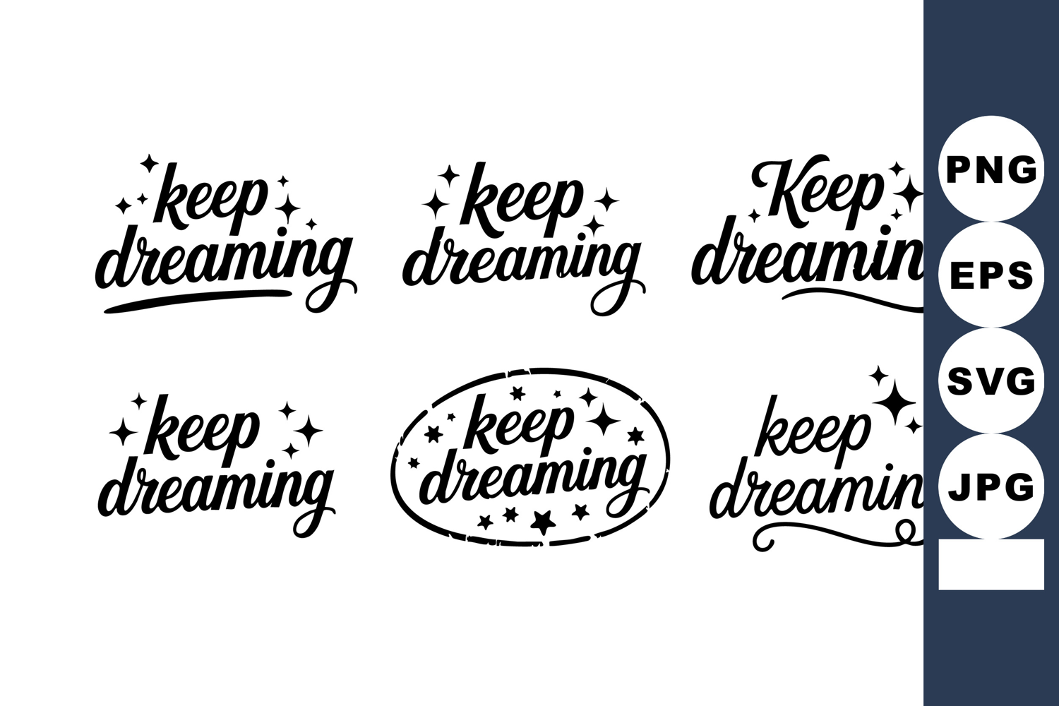 Elegant black typography designs display the phrase keep dreaming with star accents and varied styles suitable for motivational posters and creative projects peaceful inspiring.