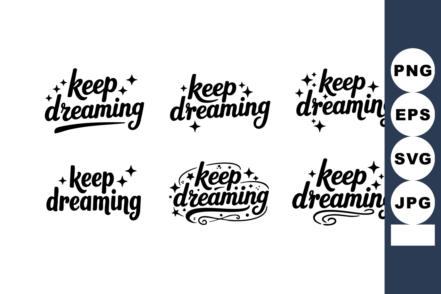 A collection of motivational keep dreaming text designs adorned with stars and elegant swirls in bold black style perfect for inspiring quotes or creative projects vibrant.