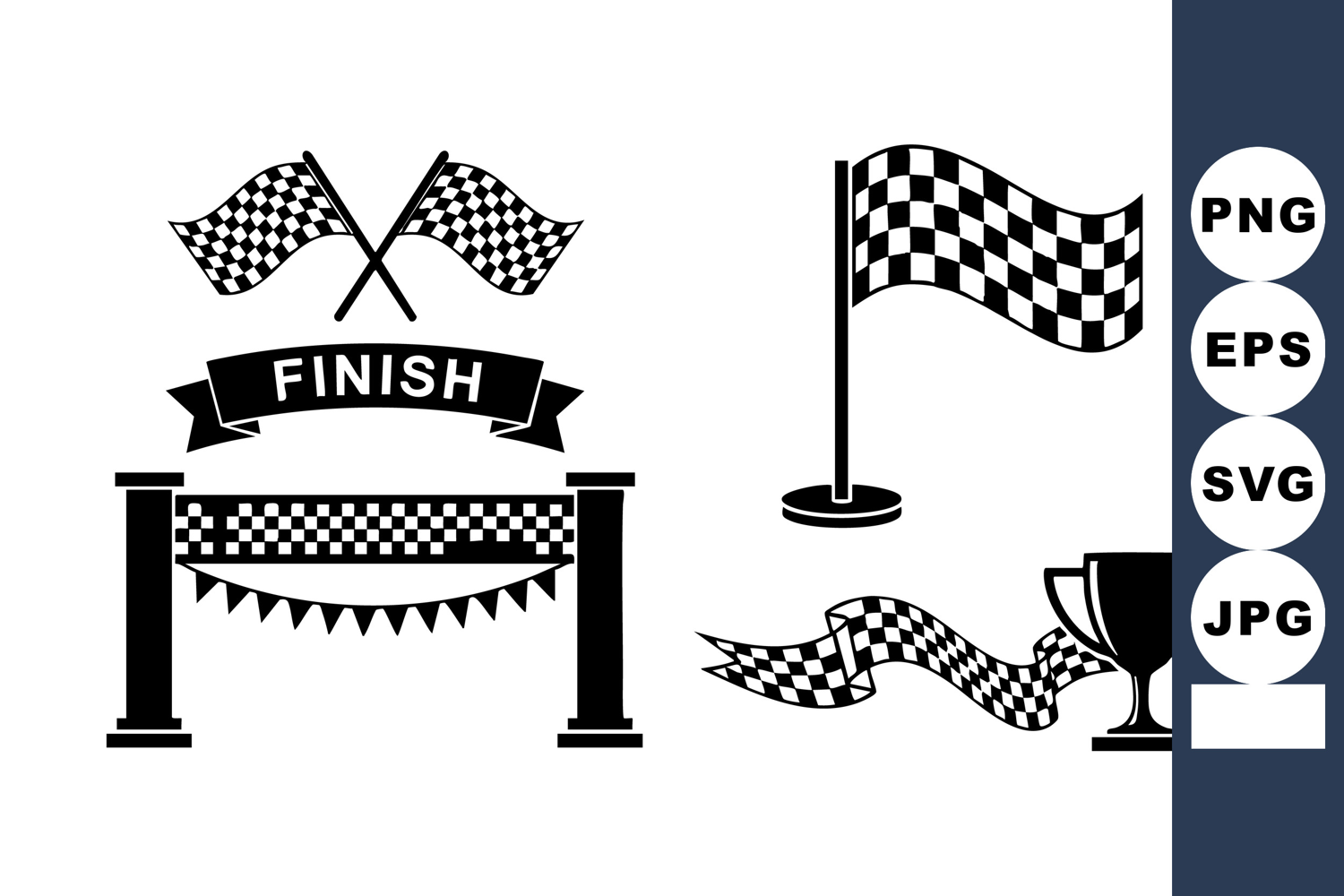 A bold black and white vector shows racing finish line elements including checkered flags banners and a trophy for competition celebration in a clean graphic style edgy.