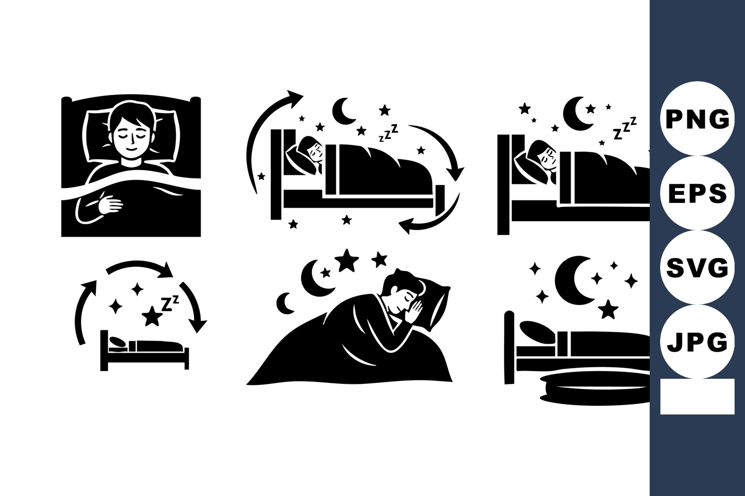 A collection of black and white vectors showing people sleeping and resting in beds with moon and star symbols representing night time and peaceful sleep mood.