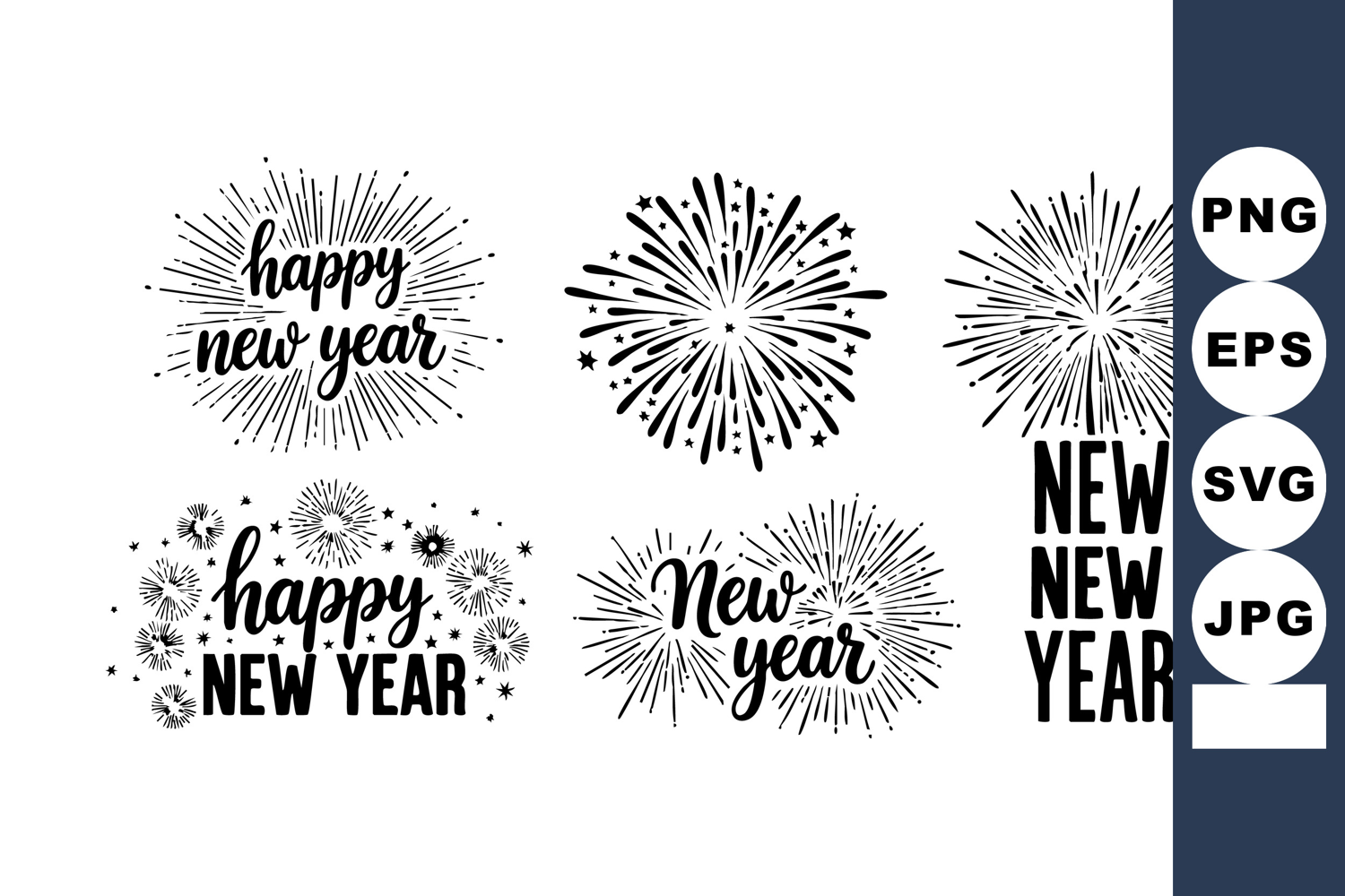 A festive collection of happy new year fireworks and text designs celebrates the arrival of the new year with bright bursts and joyful typography in a lively style. Vibrant mood.