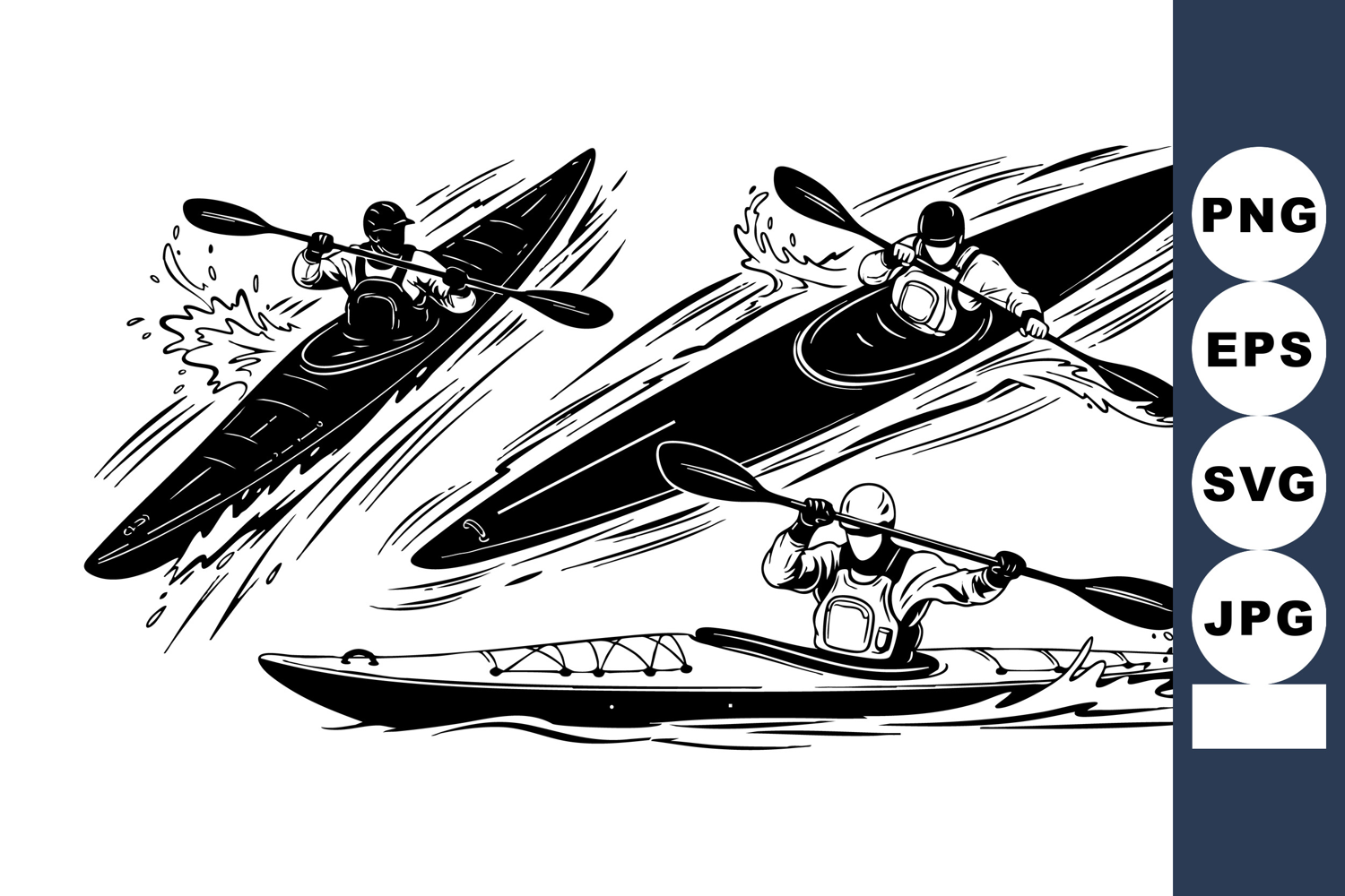 Dynamic black and white vector shows three kayakers paddling rapidly in racing kayaks on water with splash effects capturing energetic movement and competitive spirit edgy