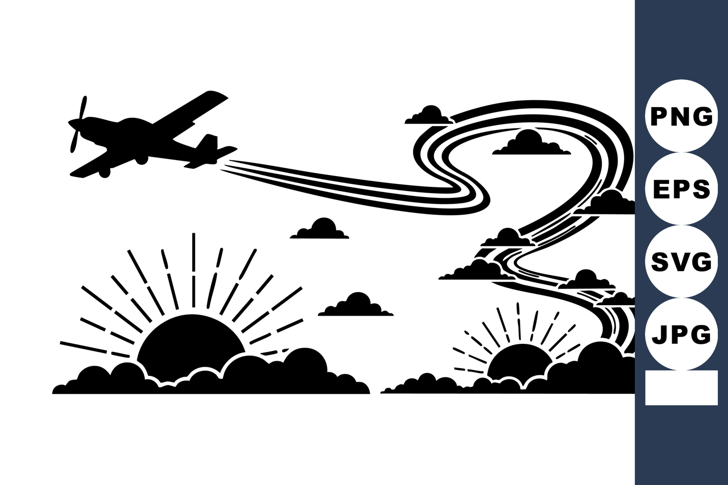 A striking silhouette of an airplane flying above stylized sunrises and sunsets with scattered clouds creates a dynamic and peaceful sky scene, evoking freedom and adventure