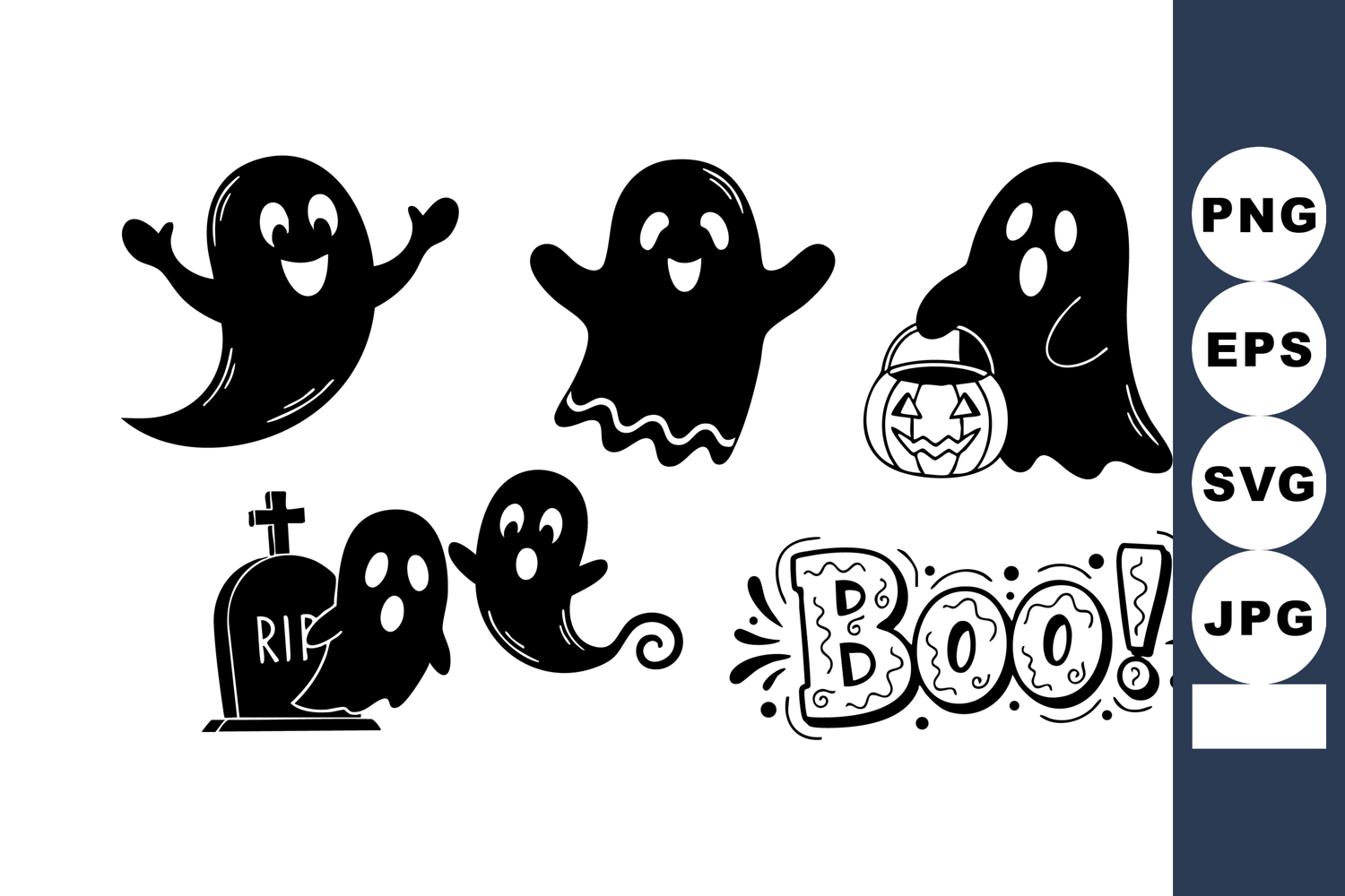 Playful black ghost silhouettes float with cheerful expressions alongside spooky pumpkin lantern and gravestone designs creating a fun Halloween atmosphere and festive mood