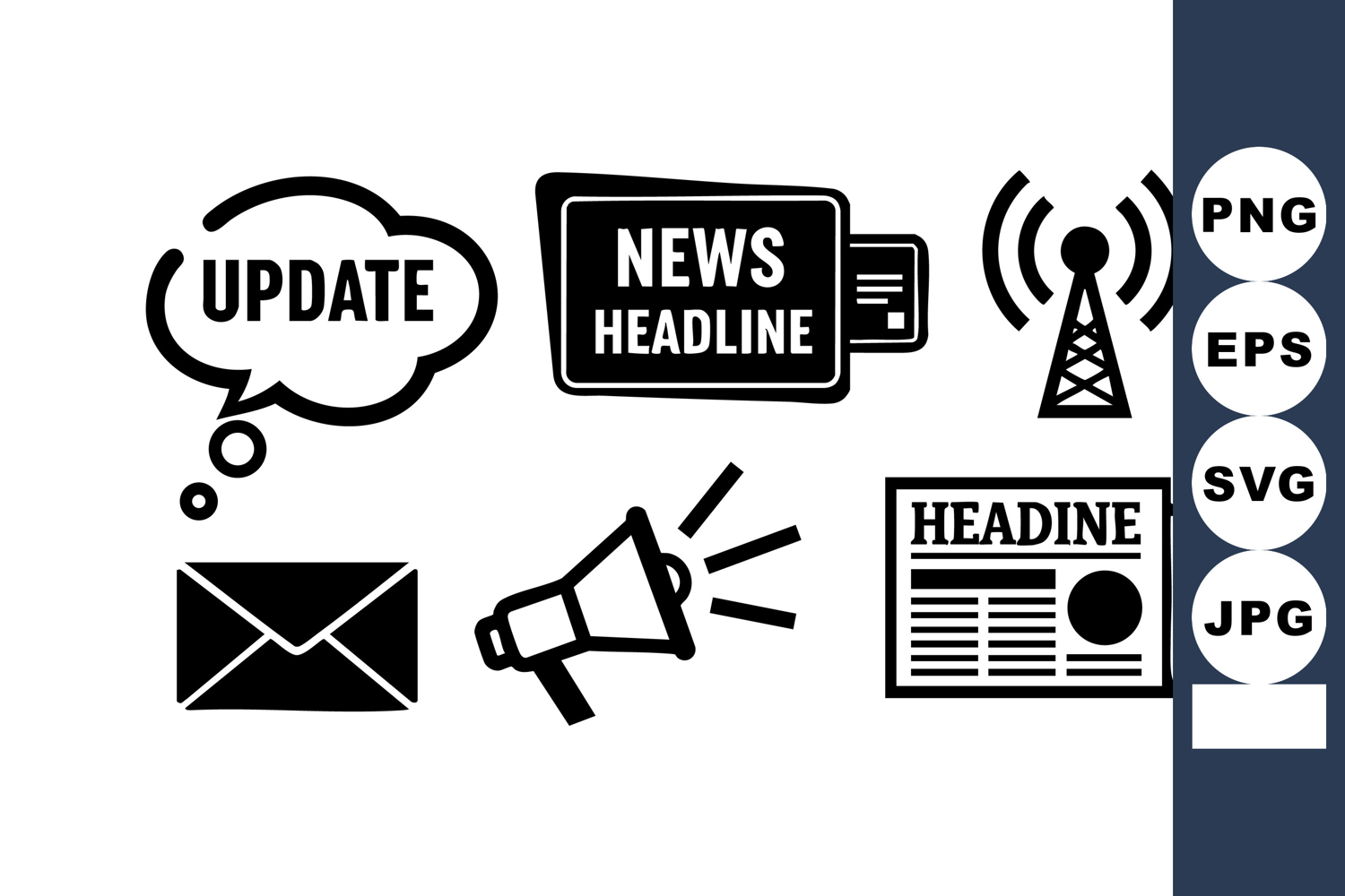 A bold black and white vector collection displays communication symbols including update bubble mail envelope megaphone news headline and radio tower for digital media uses dynamic mood