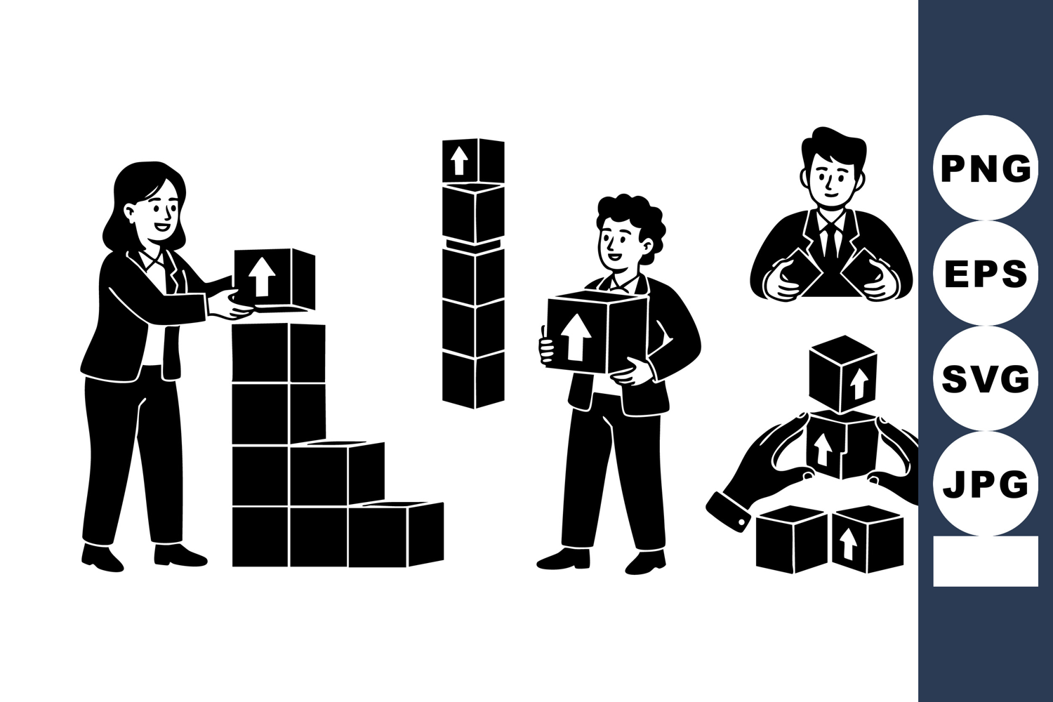 A bold black silhouette vector shows business people stacking boxes in a teamwork concept with collaboration and organization themes for professional design projects edgy