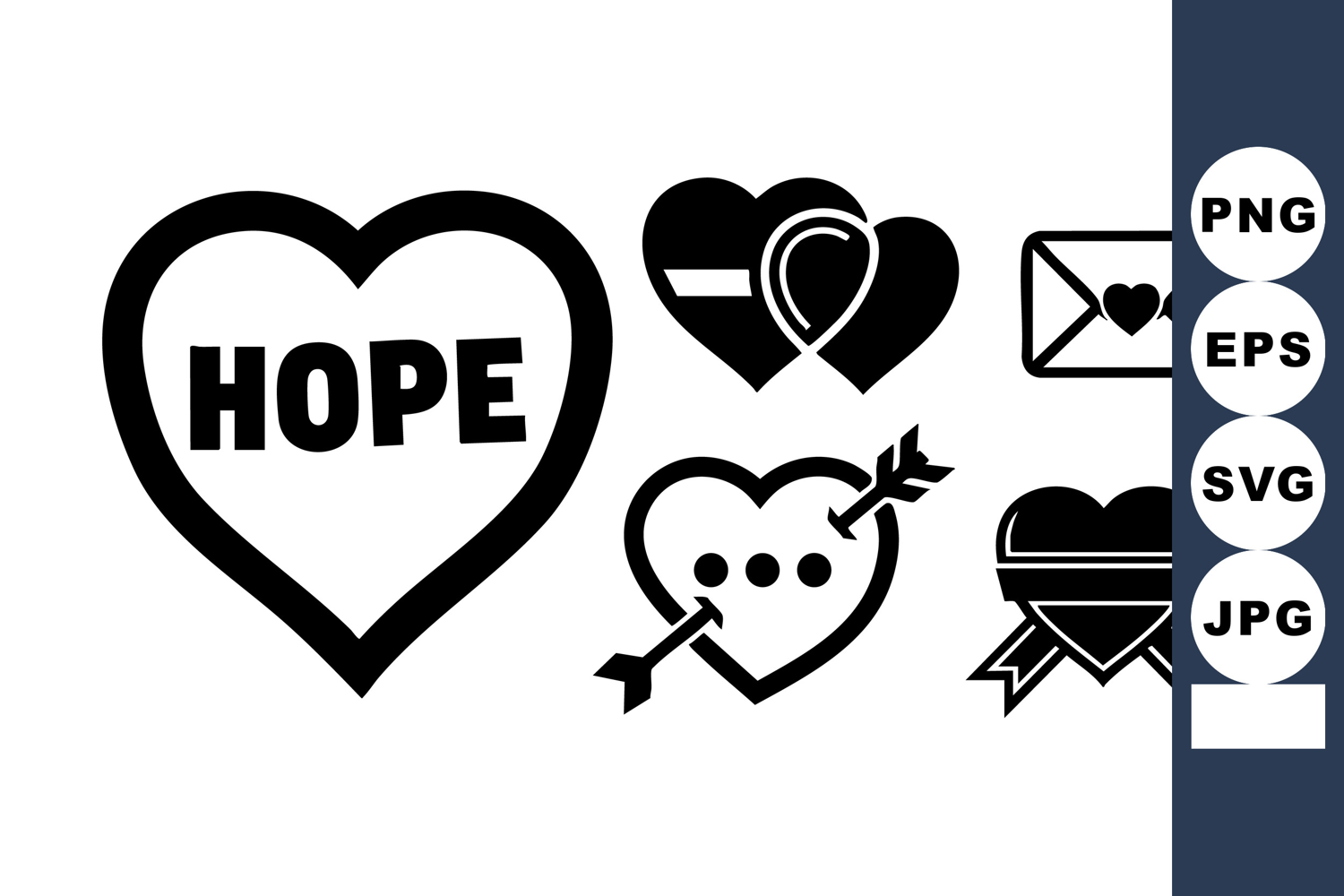 A bold black heart icon set includes hope lettering love symbols arrow pierced heart and envelope with heart for messages conveying affection and optimism in a clean style calm