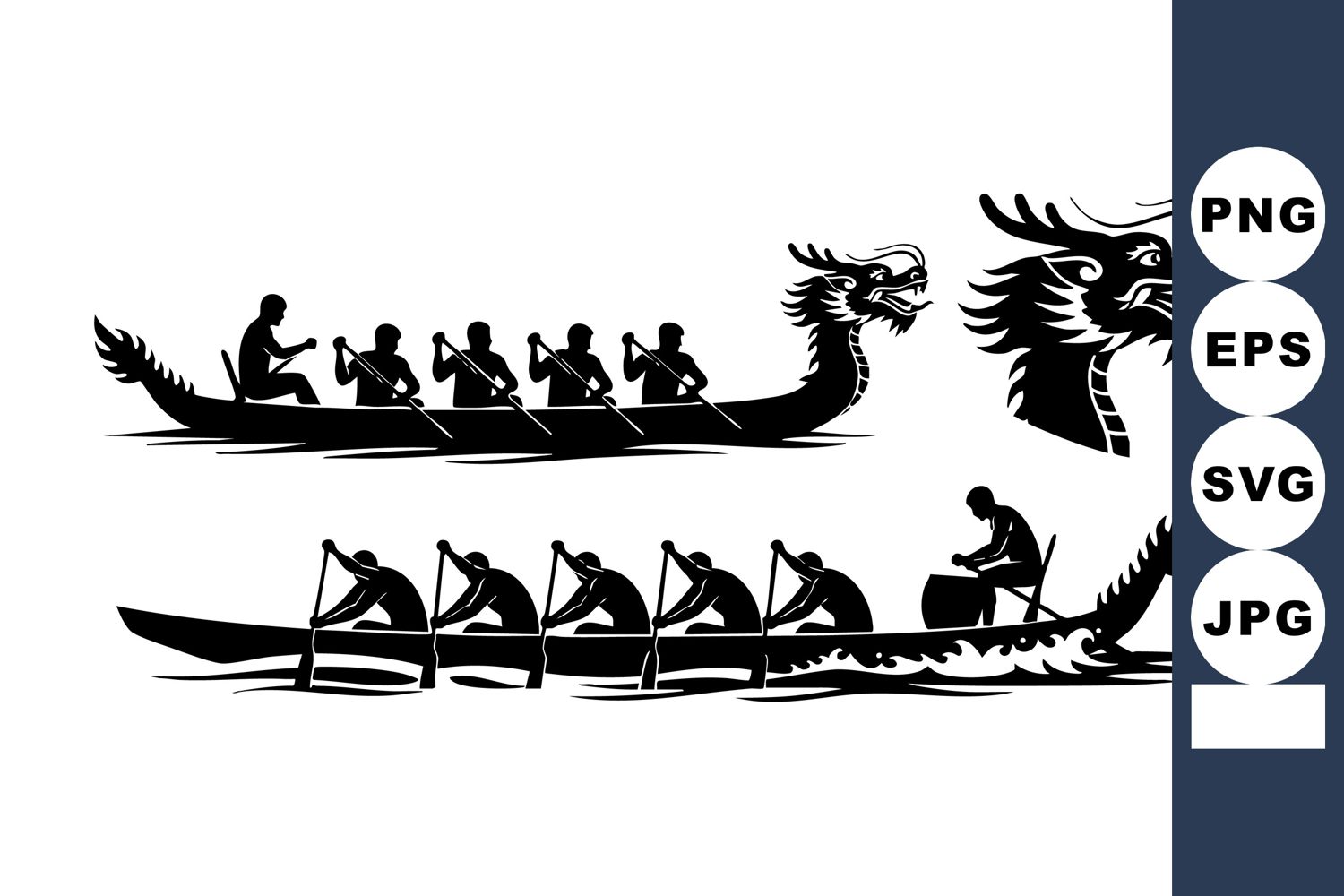 Dragon Boat Silhouette Paddlers Rowing Team Detailed Dragon Head Rowers Paddling Together Dynamic Motion Vector Intricate Dragon Design Teamwork Cultural Energy Traditional Dragon Boat Water Sport Competition Muscle Strength Fitness