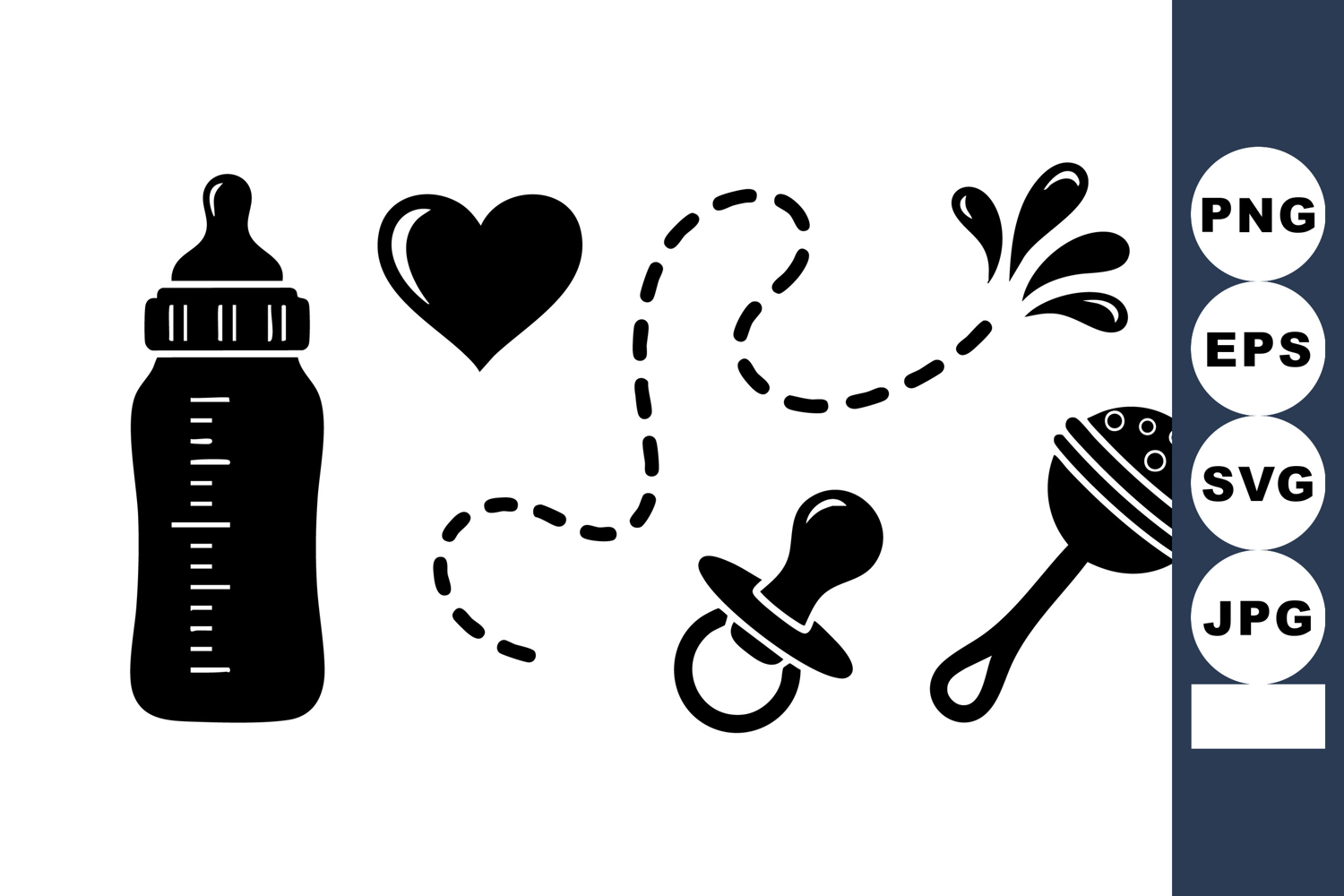 A playful vector illustration shows baby essentials including a feeding bottle, heart shape, pacifier, splash droplets, and rattle in bold black silhouette style perfect for childcare themes. playful