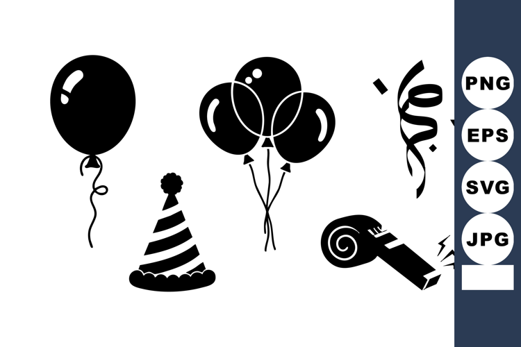 A bold black silhouette collection includes balloons party hat whistle and streamer elements ideal for festive designs and celebrations with a playful vibrant mood