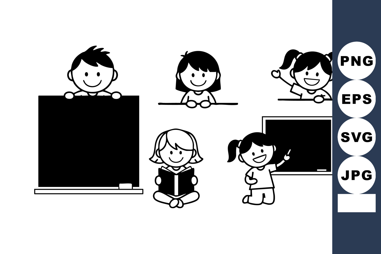 Playful children interact with blank blackboards and a book in a simple black and white vector style ideal for educational or school themed designs. Cheerful mood.