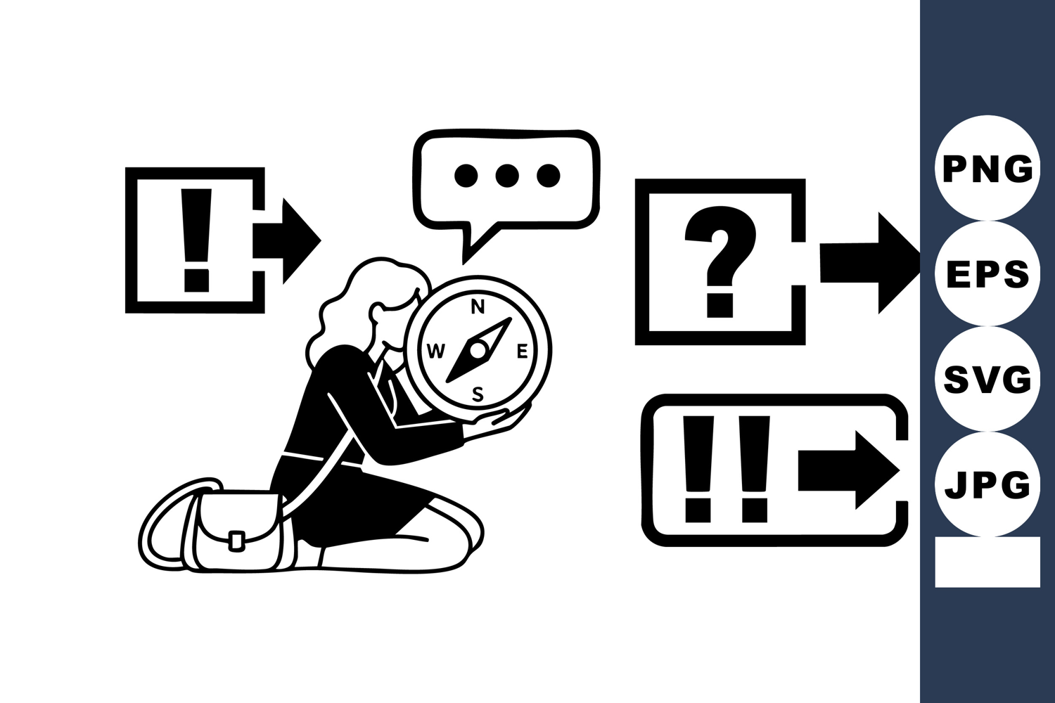 Simple Black White Woman Holding Compass Compass With Question Question And Exclamation Exclamation Icons Guidance Direction Seeking Concept Decision Making Symbol Searching For Direction Travel And Explore Path And Journey
