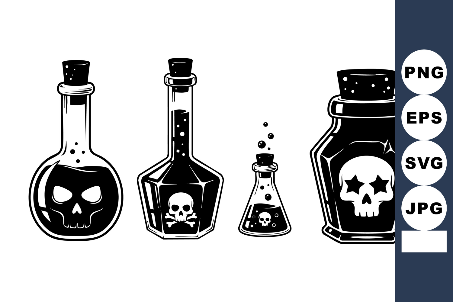 Black And White Vector Illustration Design Halloween Spooky Design Dark Mysterious Graphic Skull Poison Bottles Poison Bottle Collection Danger And Toxicity Skull Symbol Warning Gothic Eerie Art Chemical Hazard Label