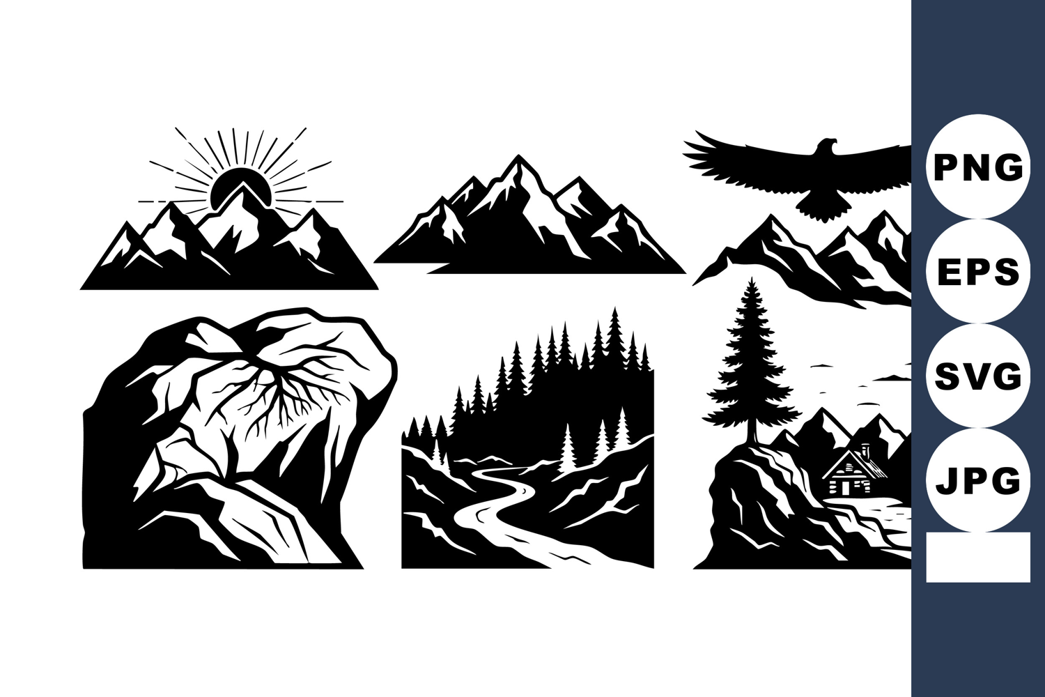 A bold vector set presents mountain silhouettes with pine forests eagle soaring and a cabin nestled among rugged nature in a striking black and white style perfect for adventurous designs vibrant
