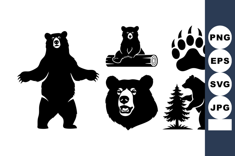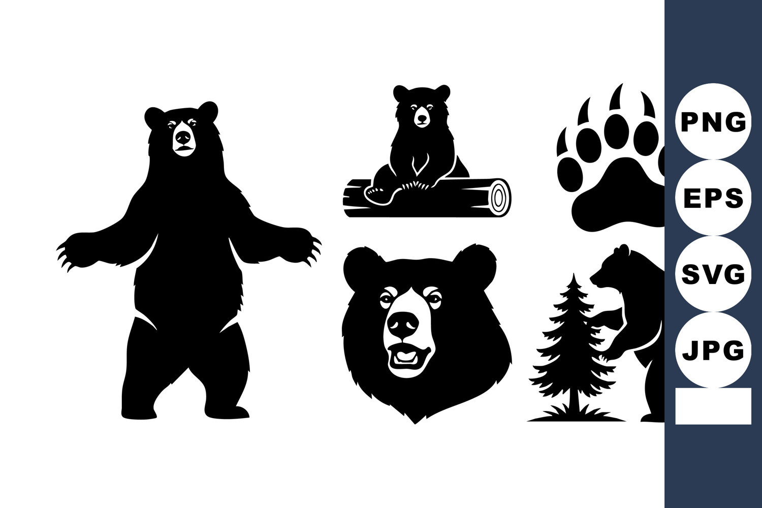 Bold black silhouettes display various bear poses including standing, sitting, and face closeup alongside a paw print and pine tree, ideal for wildlife or nature themed designs, striking and strong.