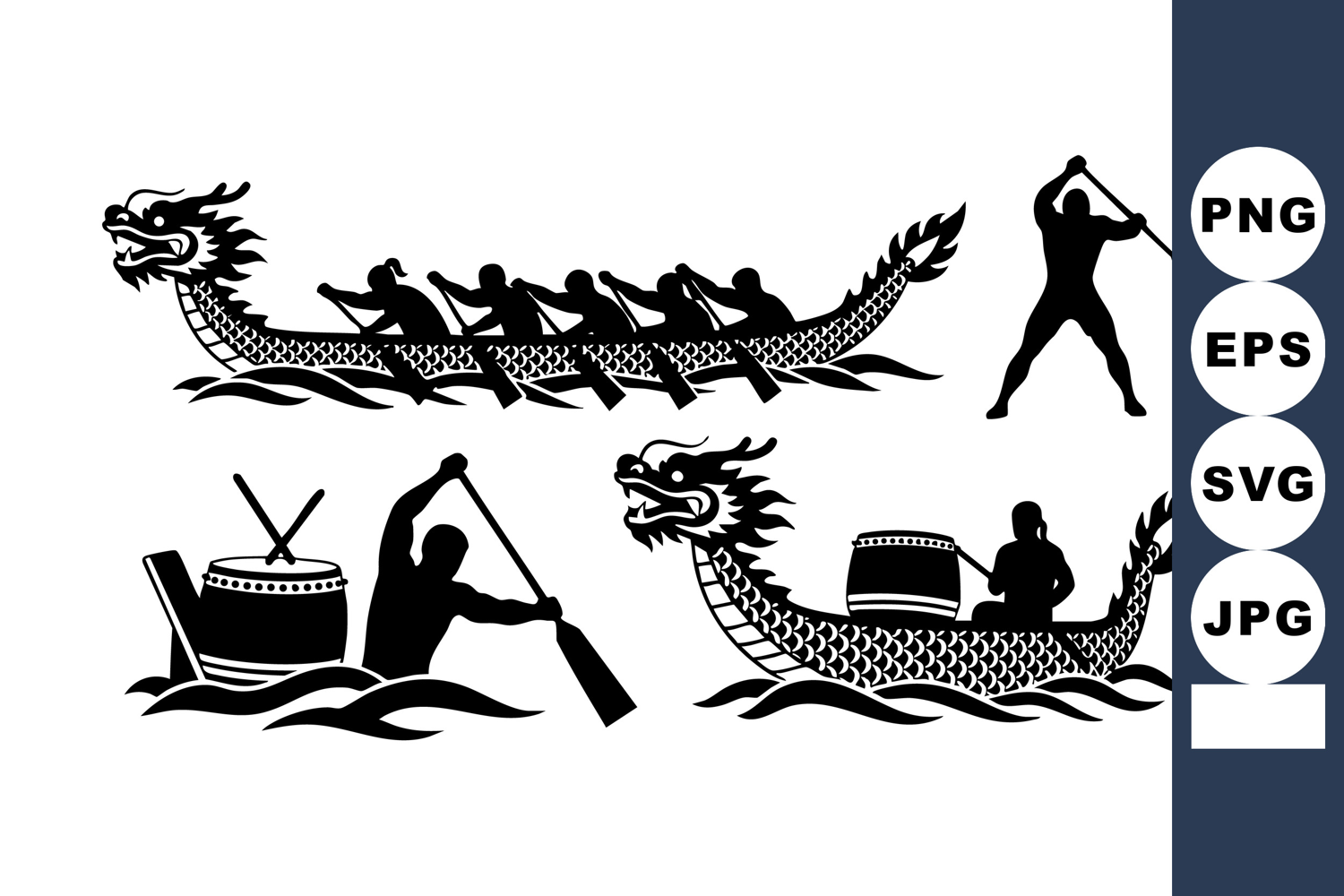 Dynamic black silhouettes depict dragon boats with rowers and a drummer in action on water, highlighting teamwork and traditional racing in a bold graphic style, energetic mood