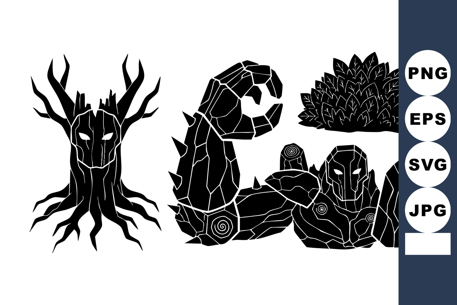 Dark silhouette vector shows a mystical wood spirit with antlers and a powerful stone golem alongside a bush element creating a fantasy atmosphere and mythical mood
