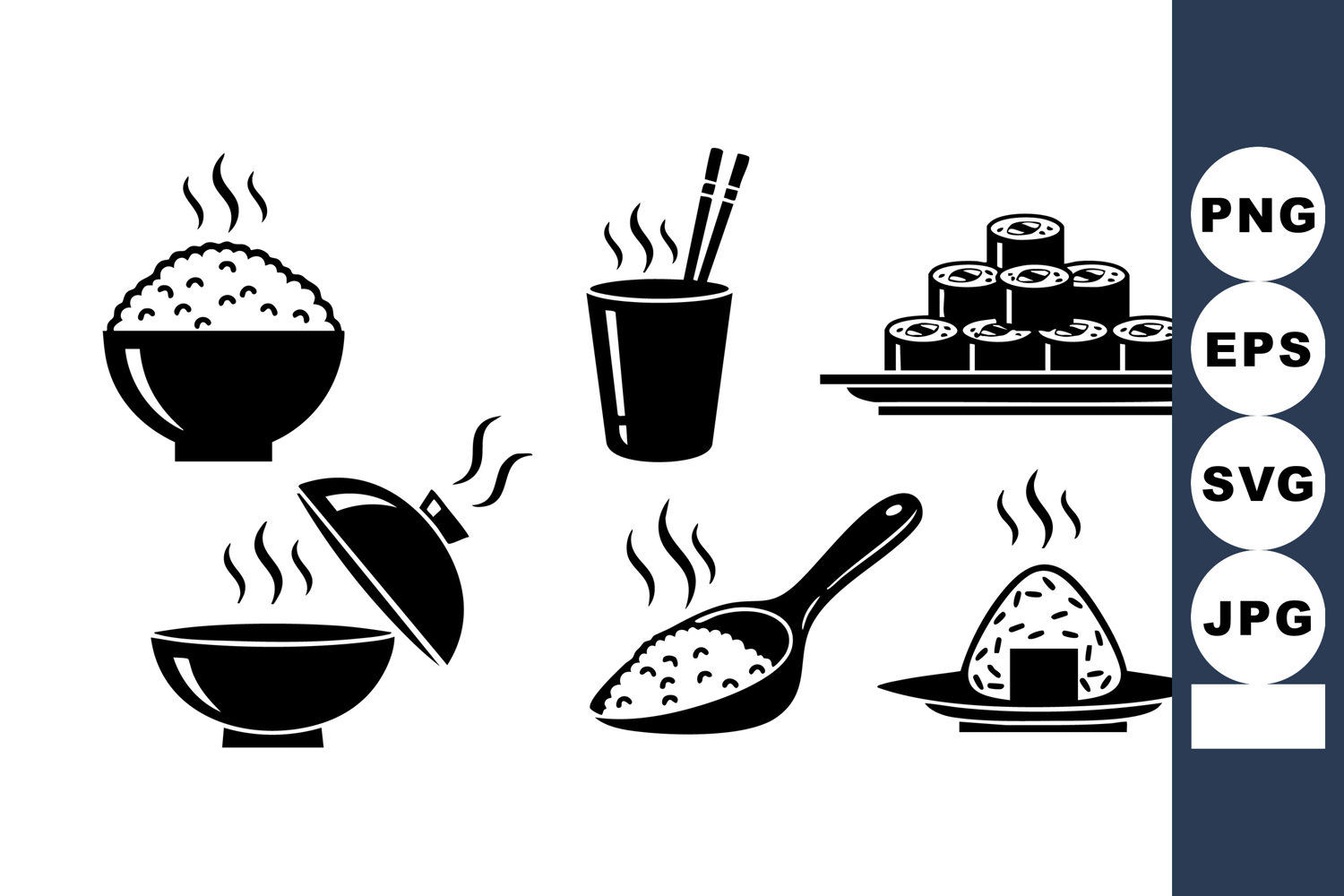 A bold black silhouette collection shows steaming Japanese rice dishes sushi bowl and chopsticks in simple vector style perfect for menu or food design vibrant