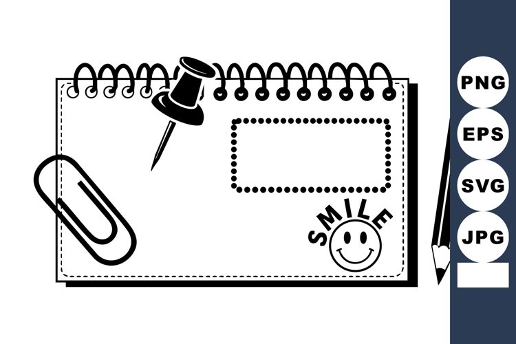 A black and white vector displays a spiral notebook page with a pencil, paperclip, and smiley face stamp design offering a clean and playful stationery concept. Minimalist style and crisp lines create a professional yet fun mood.