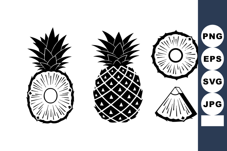 A bold black and white vector illustration shows whole pineapple and different sliced pieces in silhouette style suitable for logos and tropical designs with a crisp clean look vibrant