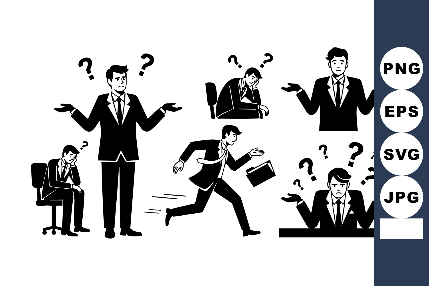 Businessman In Suit Businessman Confused Poses Thinking Businessman Vector Businessman Question Marks Confused Man Gesture Businessman With Briefcase Man Showing Confusion Businessman Thoughtful Pose Businessman Standing Gesture Man Sitting Office