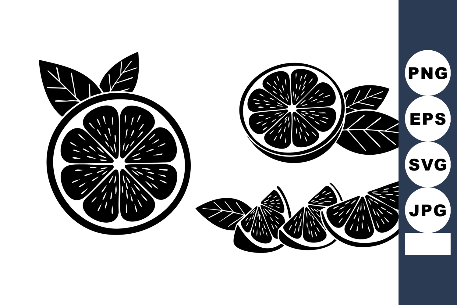 A bold black and white vector displays stylized citrus fruit slices with detailed leaves and segments. The design is clean and versatile for fresh food or natural themes, striking and simple.