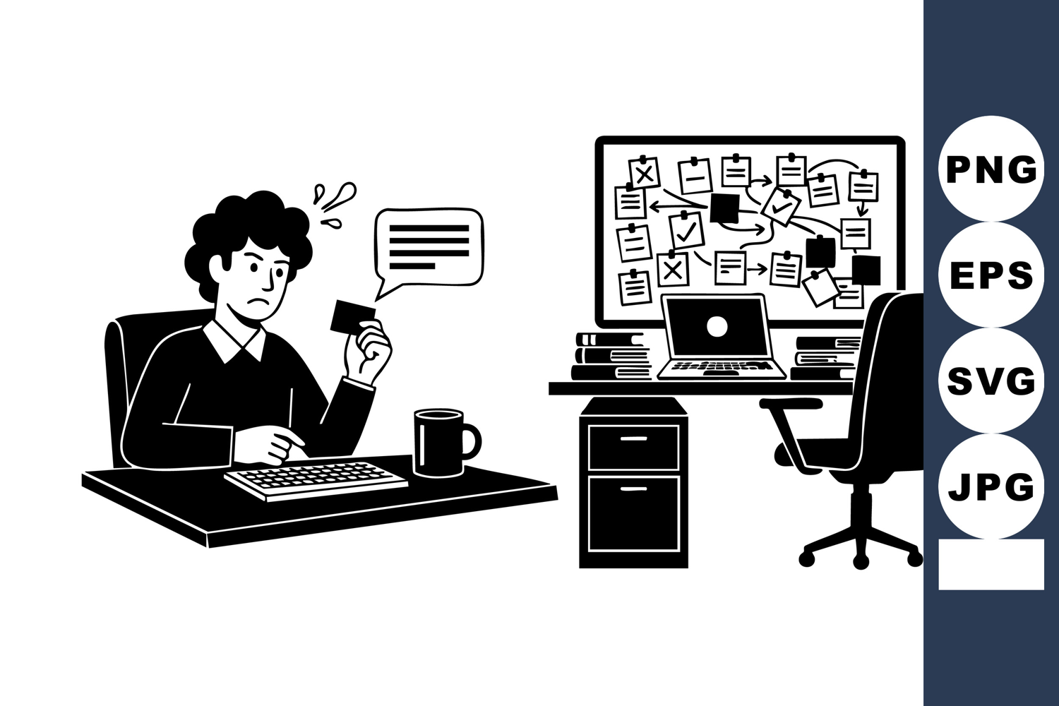 An anxious man sits at a desk holding a credit card while a cluttered office space shows a computer and a board filled with tasks conveying pressure and stress