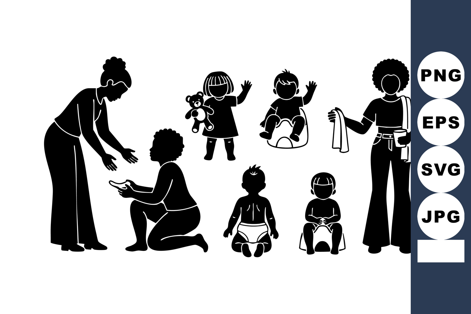 Women Children Playful Caregiving Silhouettes Vector example image 1
