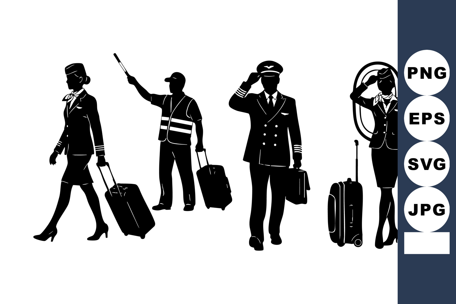 A bold black silhouette composition shows airline pilots and flight attendants in uniform carrying luggage and signaling, capturing airport work life in a dynamic style. Professional and sleek.