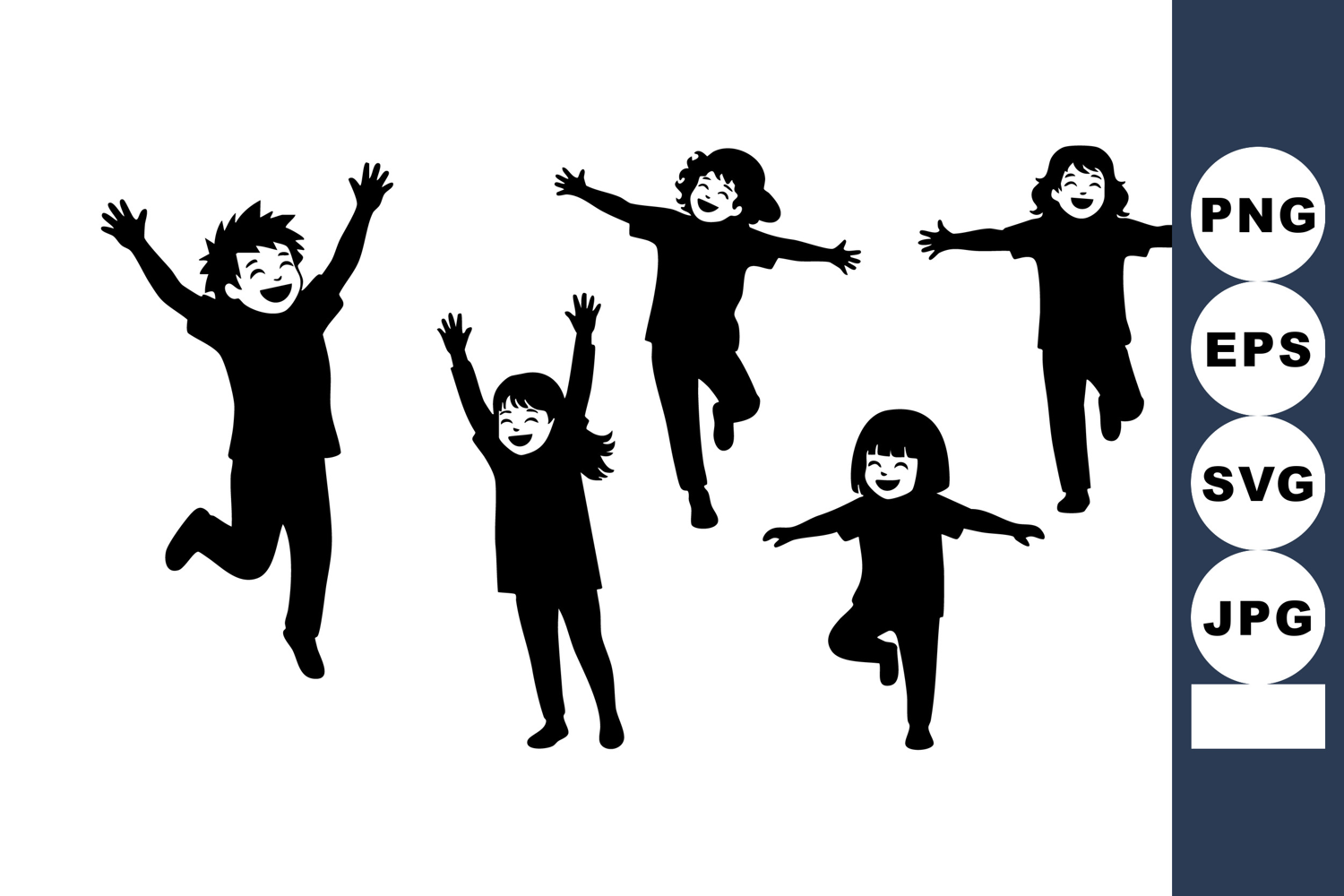 Energetic silhouettes of children jumping with arms raised express happiness and freedom in playful poses perfect for lively designs and cheerful themes vibrant