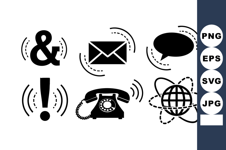 A bold black silhouette collection displays communication icons including a vintage telephone email envelope chat bubble exclamation mark and global network symbol in vector style edgy.