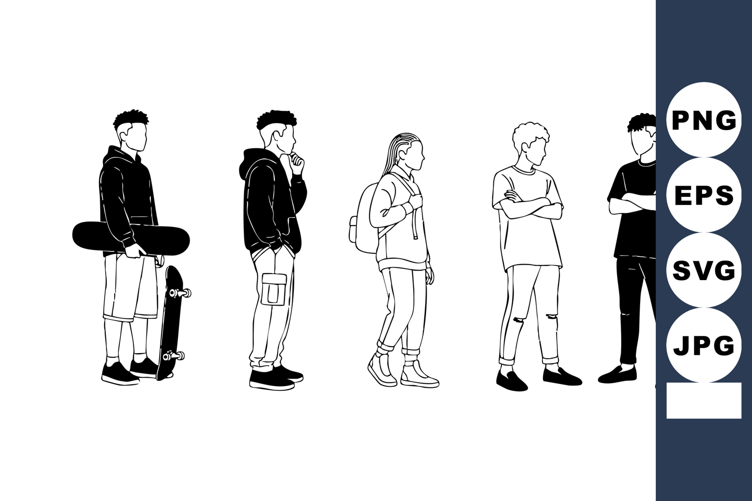 A monochrome vector shows five young individuals in casual urban clothing with backpacks and a skateboard standing in various relaxed poses. The design conveys youthful modernity and street style, edgy.