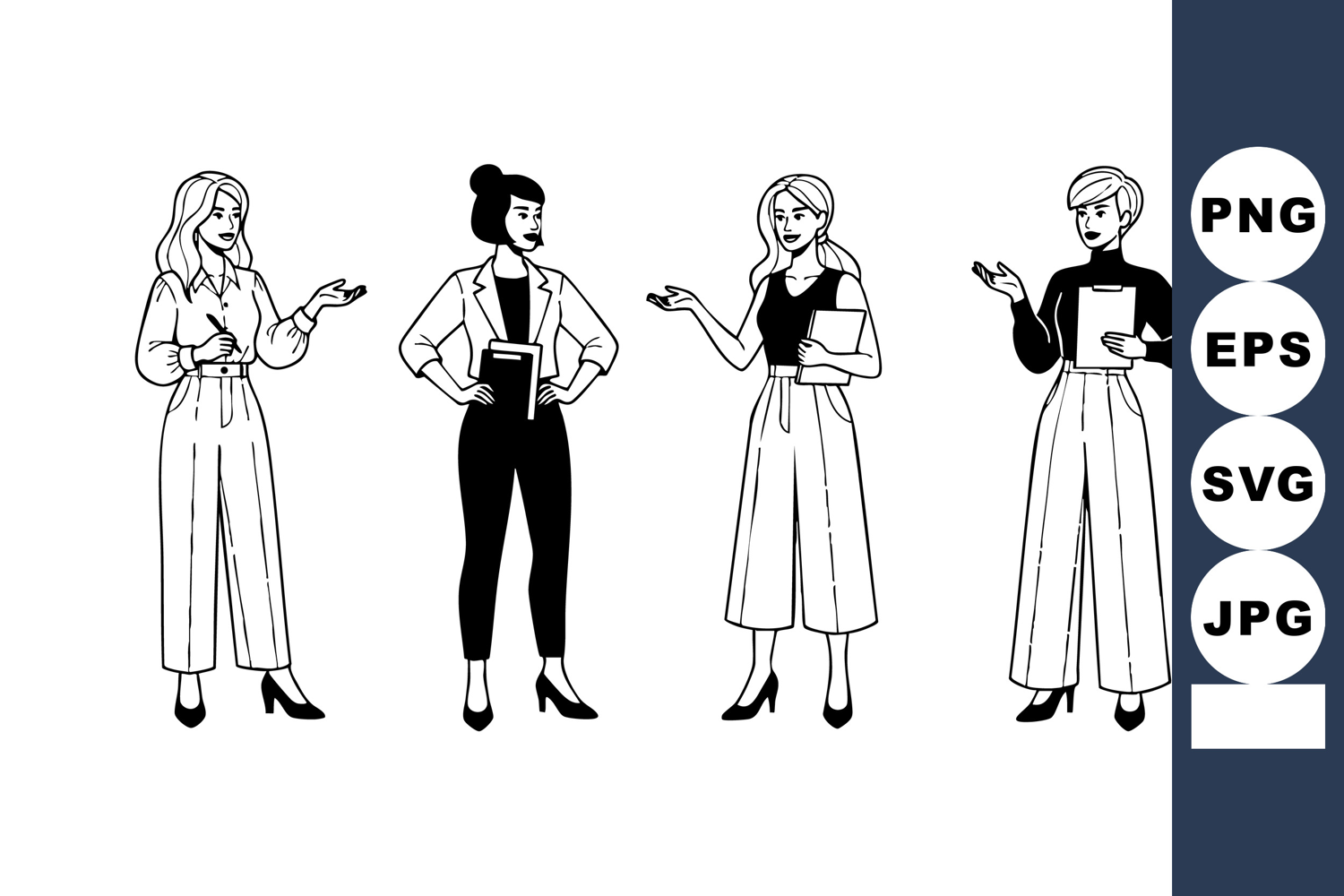 A black and white vector illustration presents four confident business women in varied professional outfits standing and gesturing naturally with a calm and professional mood