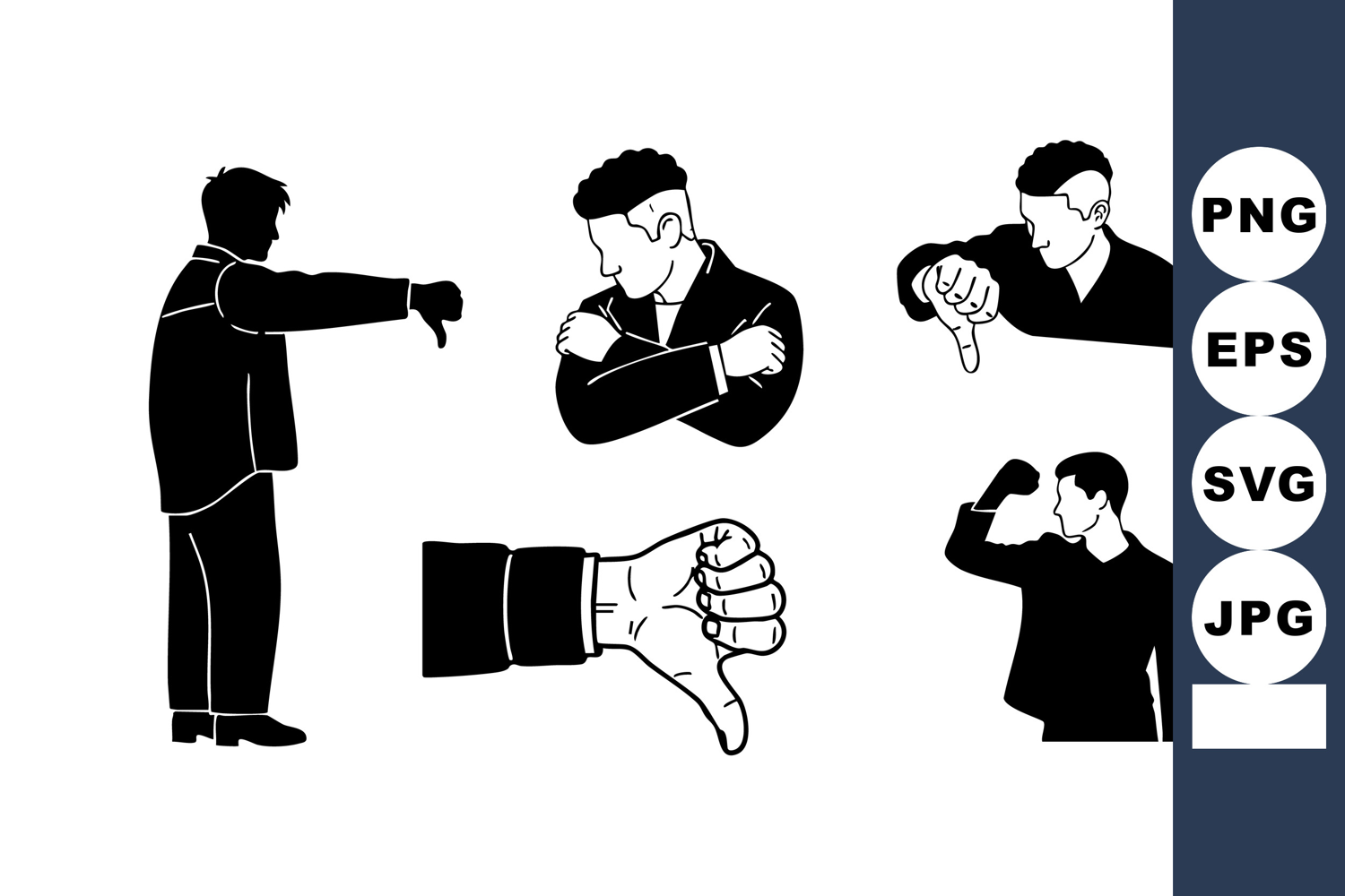A bold silhouette design displays a man expressing thumbs down and negative body language with crossed arms and a fist, conveying disapproval and frustration in a striking style.