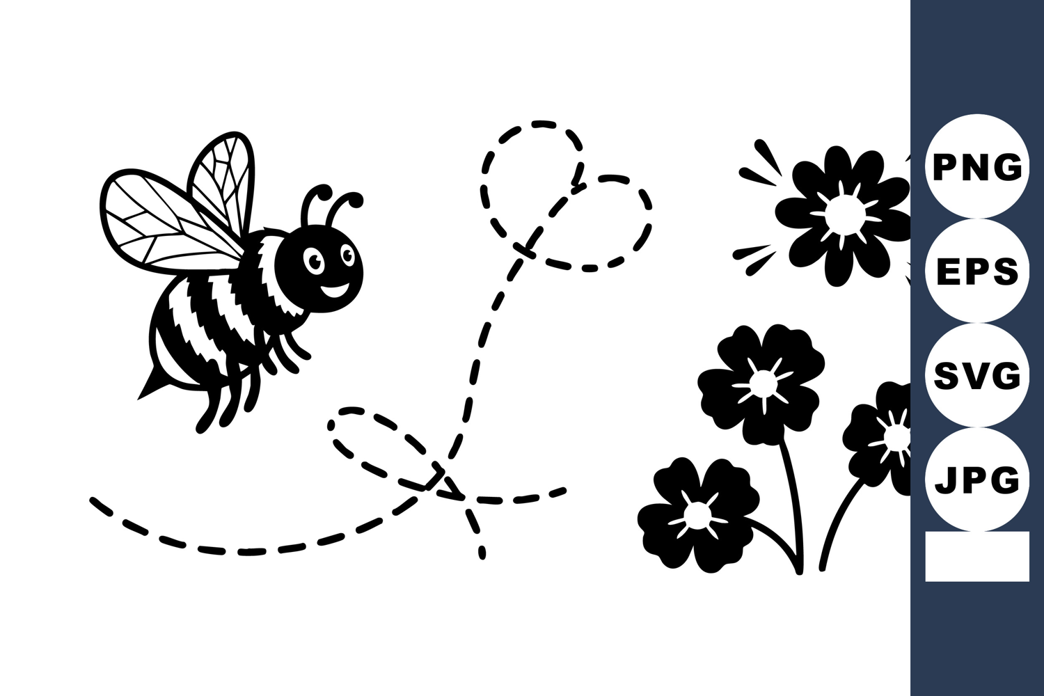 Black And White Bee Heart Trail Cute Bee Flying Simple Flower Silhouettes Playful Bee Vector Heart Shaped Trail Stylized Simple Flowers Nature Spring Designs Friendly Garden Insect Cheerful Bee Flying